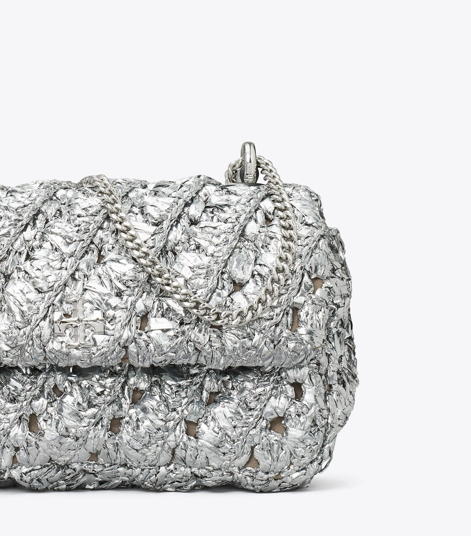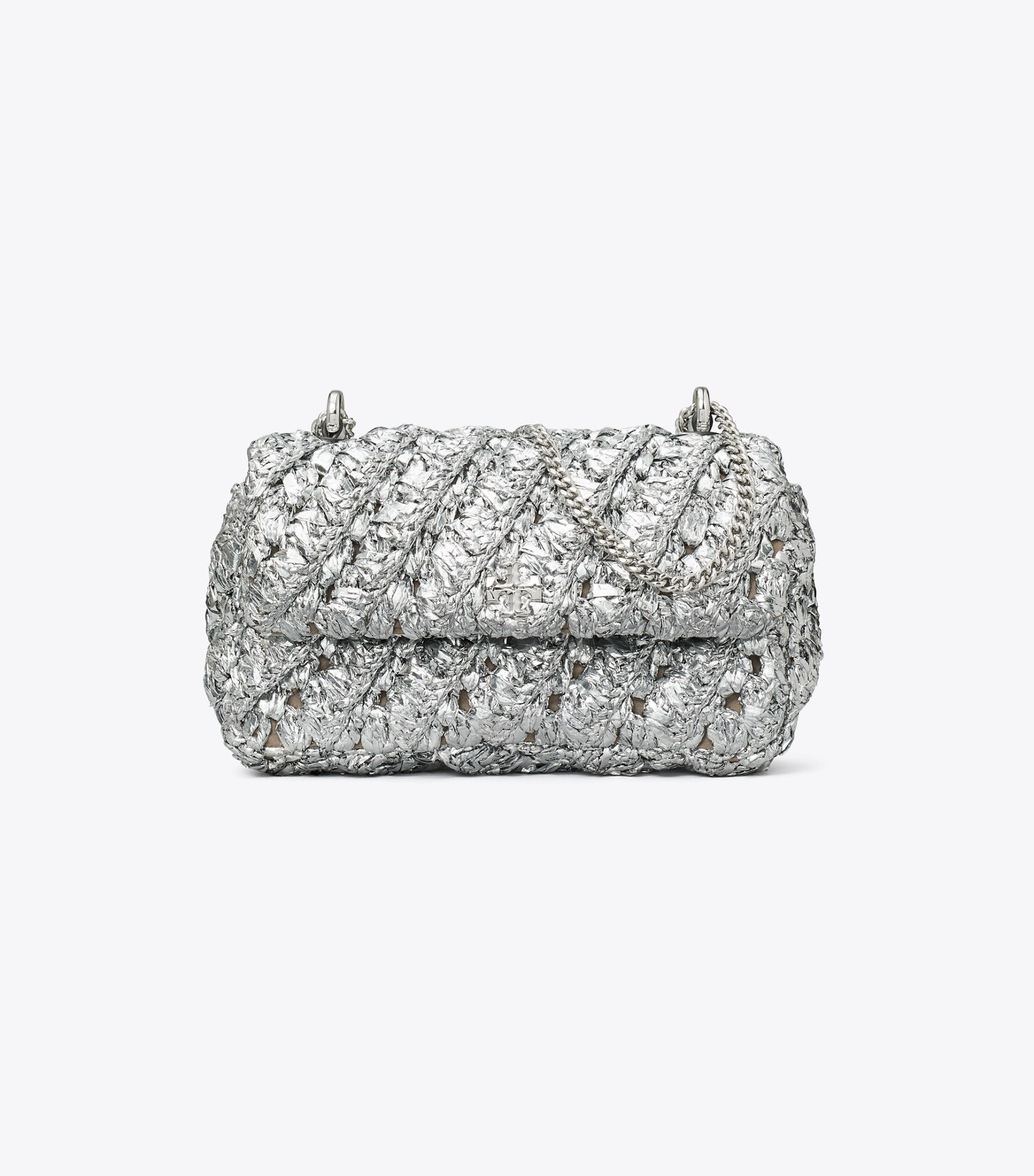 The Mini Kira Flap Bag is a compact day-to-evening silhouette that fits perfectly under the arm. Made of hand-crocheted metallic nylon with leather trim. Finished with a convertible crossbody chain strap.