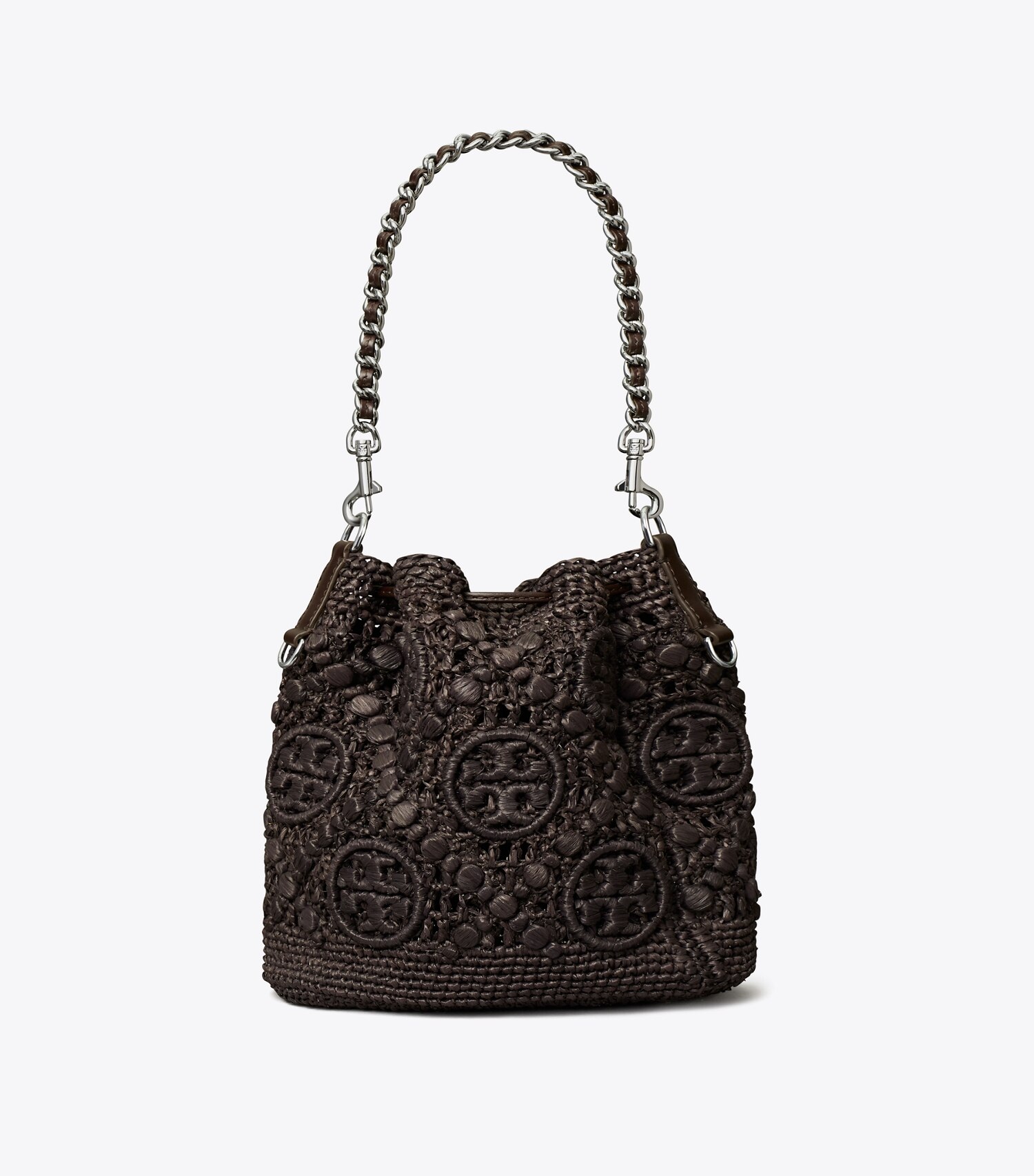 Our signature motif. The collection speaks to the timelessness of great style. Lightweight and durable, the T Monogram Bucket Bag is hand-woven in natural raffia. Trimmed in fine leather and designed with an adjustable top handle that can be worn over the shoulder and removable crossbody strap. Drawstrings are cinched with a metal logo cord stopper. Press and hold to loosen drawstrings and release to lock. A detachable zipper pouch keeps things organized. Every detail is considered, with special attention to function and versatility.