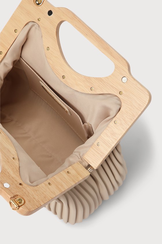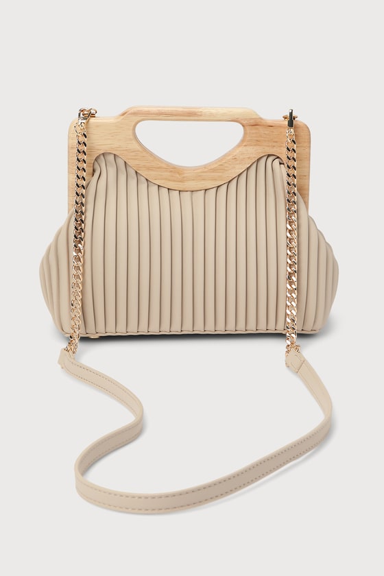 When we're going out for the day, we always find ourselves reaching for the Press Re-Pleat Beige Pleated Handbag! This chic bag has an understated yet stylish presence with its wooden handle and faux leather composition that shapes a pleated body with a flat bottom. Open to reveal a roomy interior with a large sidewall pocket. Removable gold chain strap.