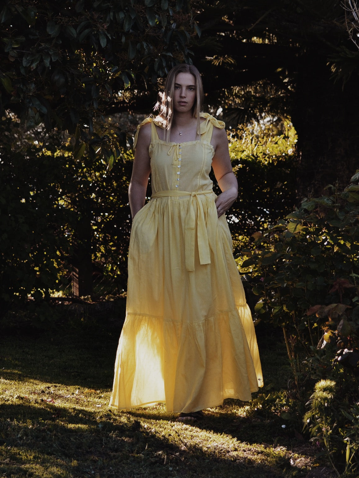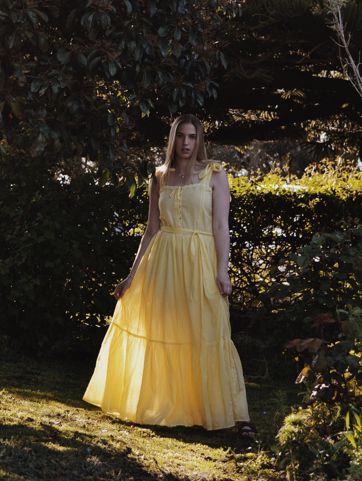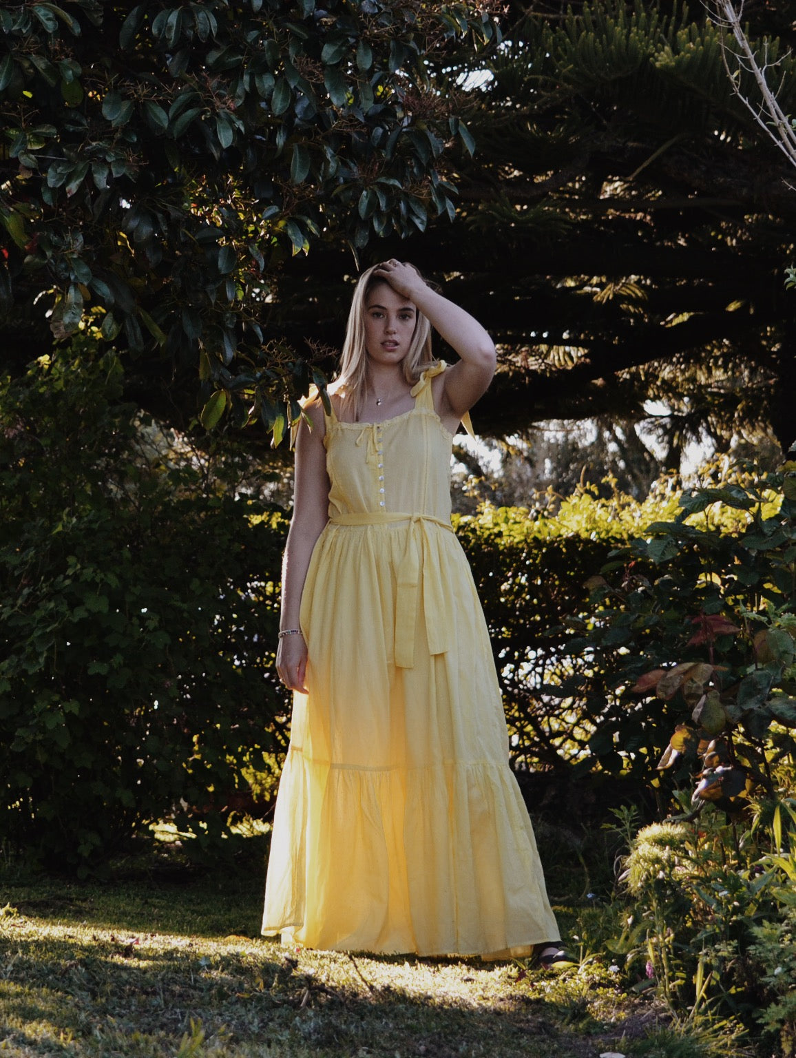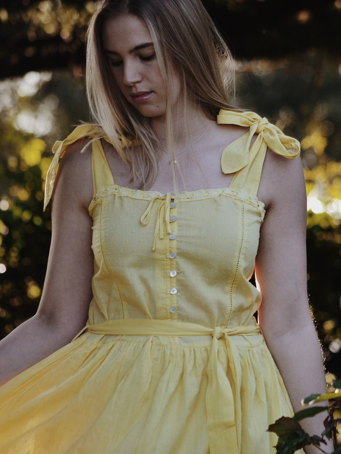 The dreamiest of dresses, made for wandering the garden in the sunshine and picnics under apple trees. Beautifully soft with feminine lace detailing and a long flowing silhouette. Featuring cotton lace, tie straps and a functional button opening, perfect for breastfeeding.