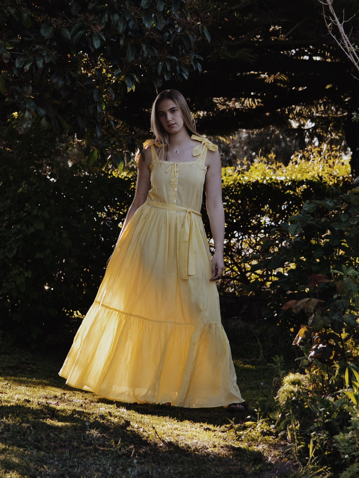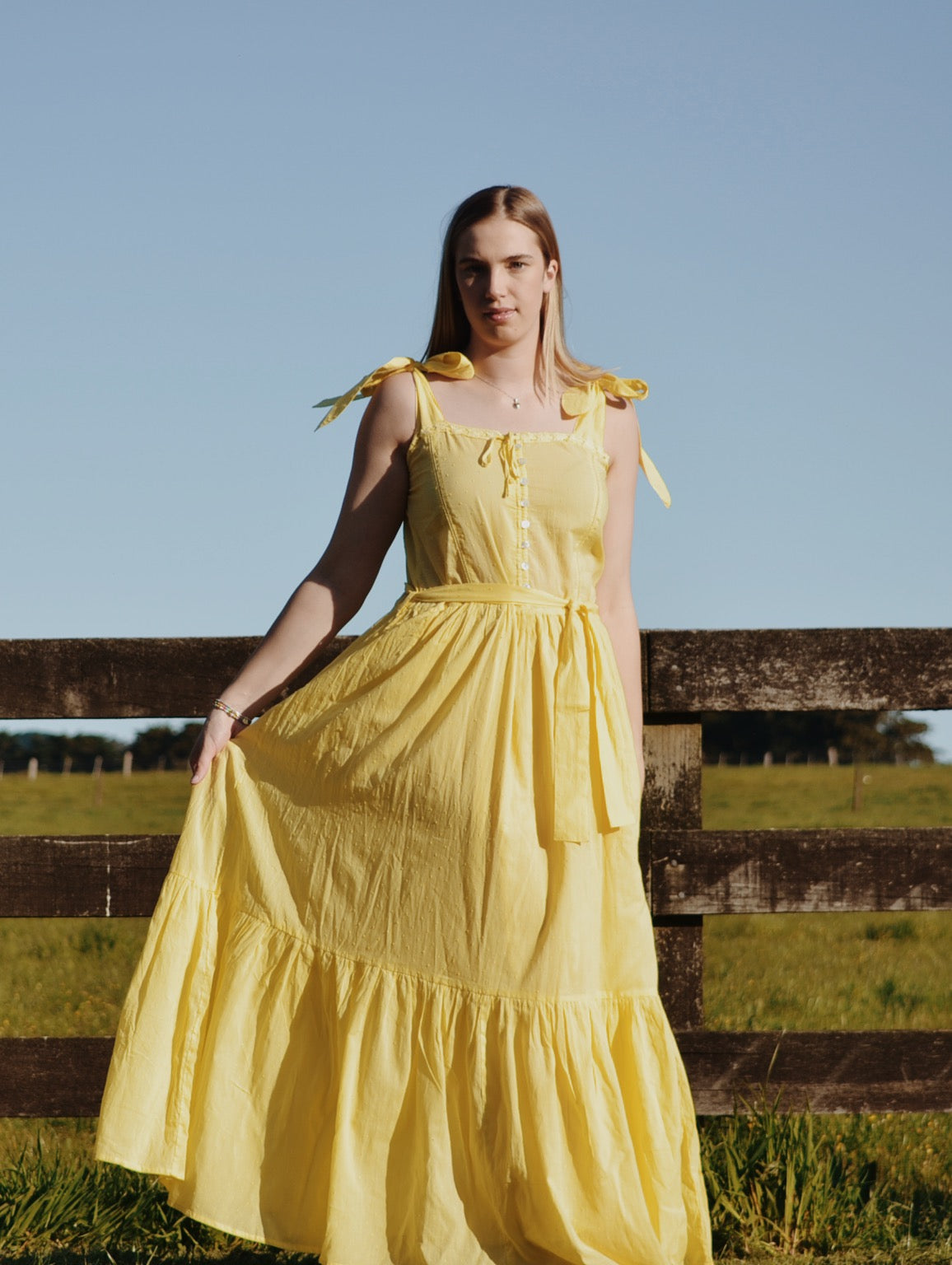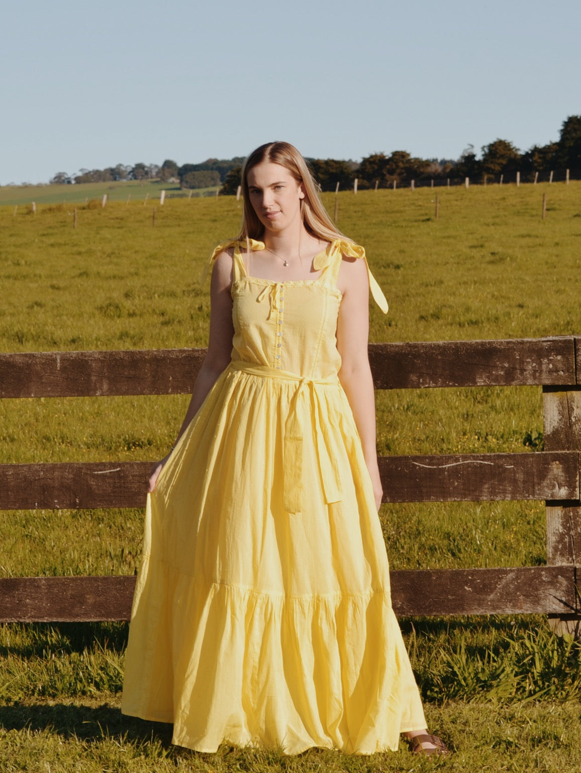 The dreamiest of dresses, made for wandering the garden in the sunshine and picnics under apple trees. Beautifully soft with feminine lace detailing and a long flowing silhouette. Featuring cotton lace, tie straps and a functional button opening, perfect for breastfeeding.