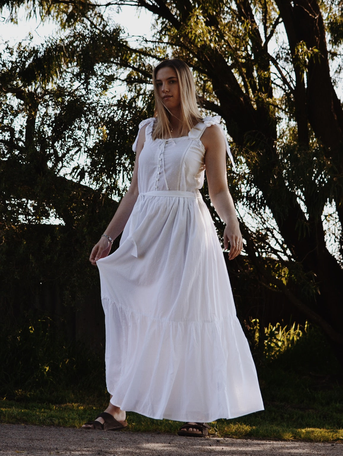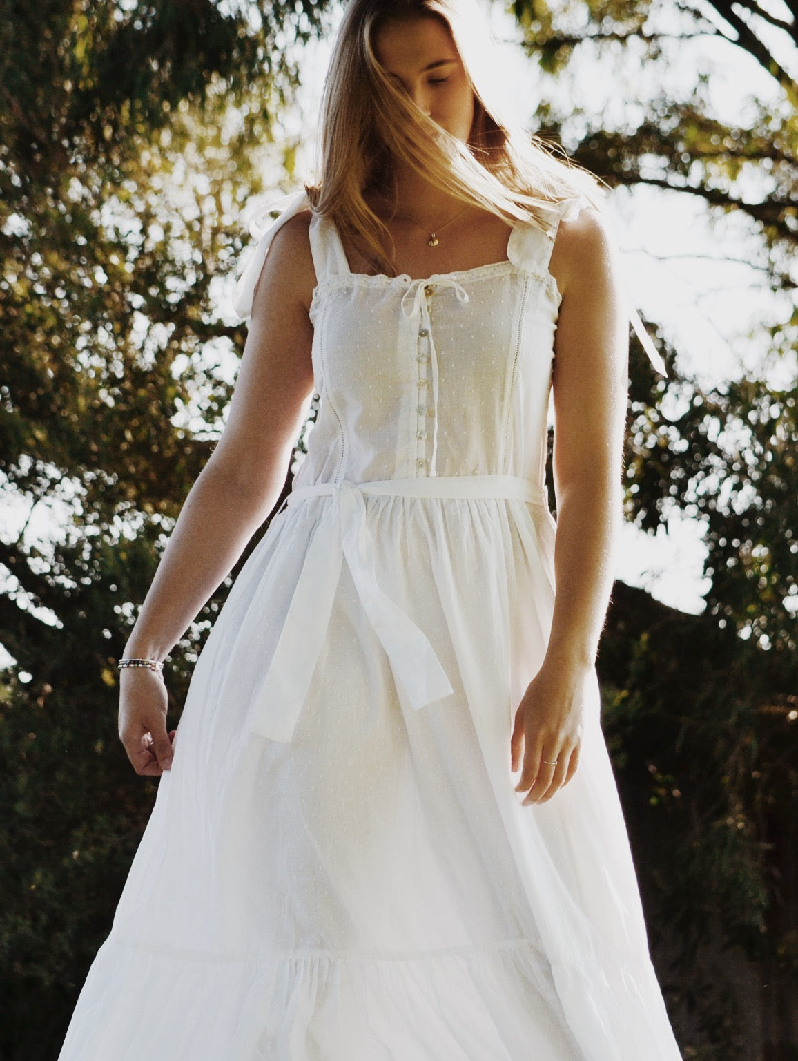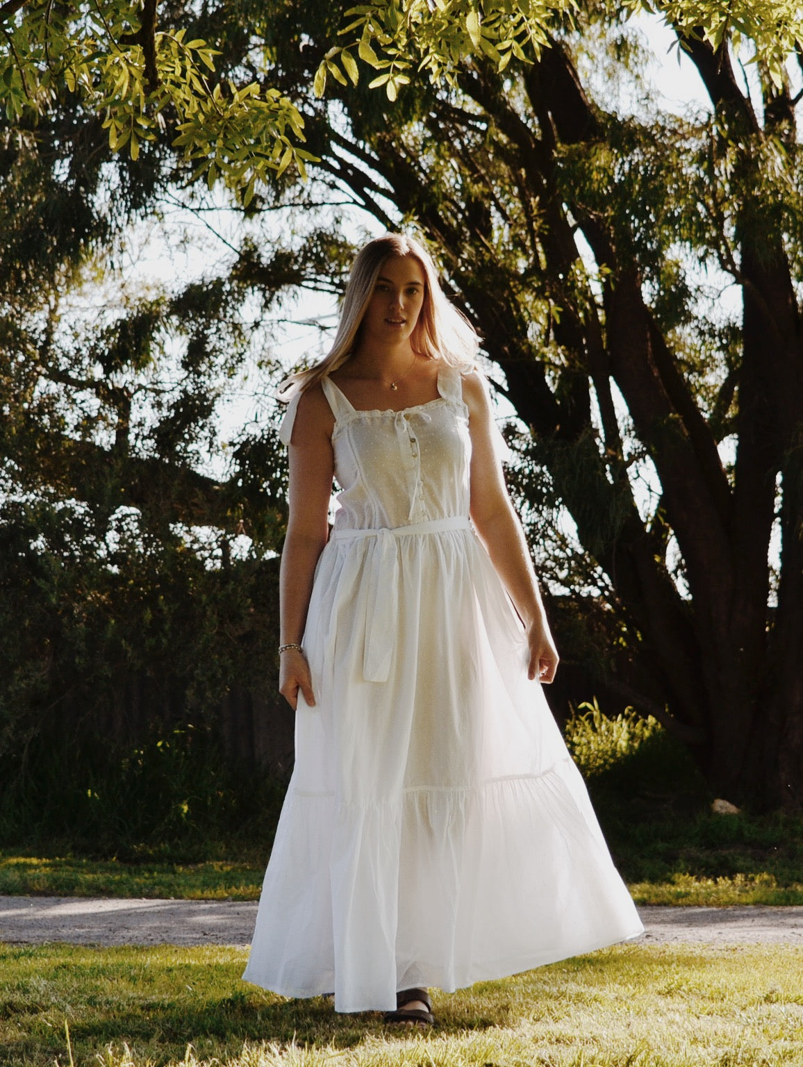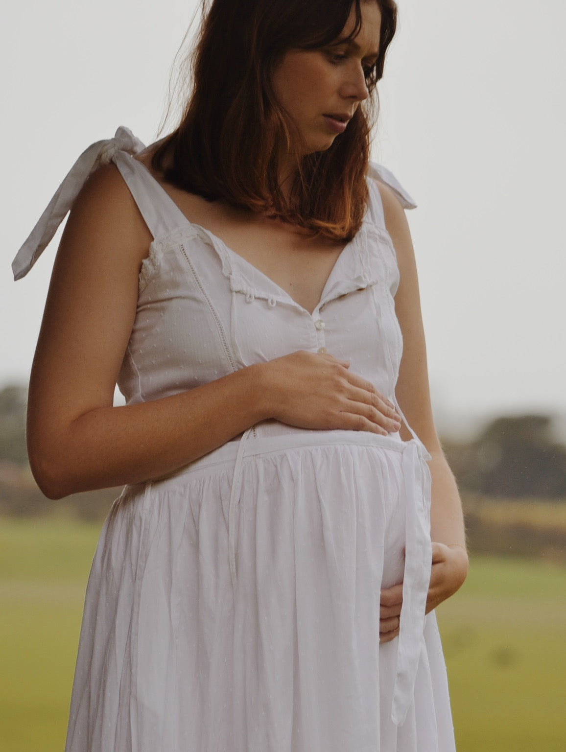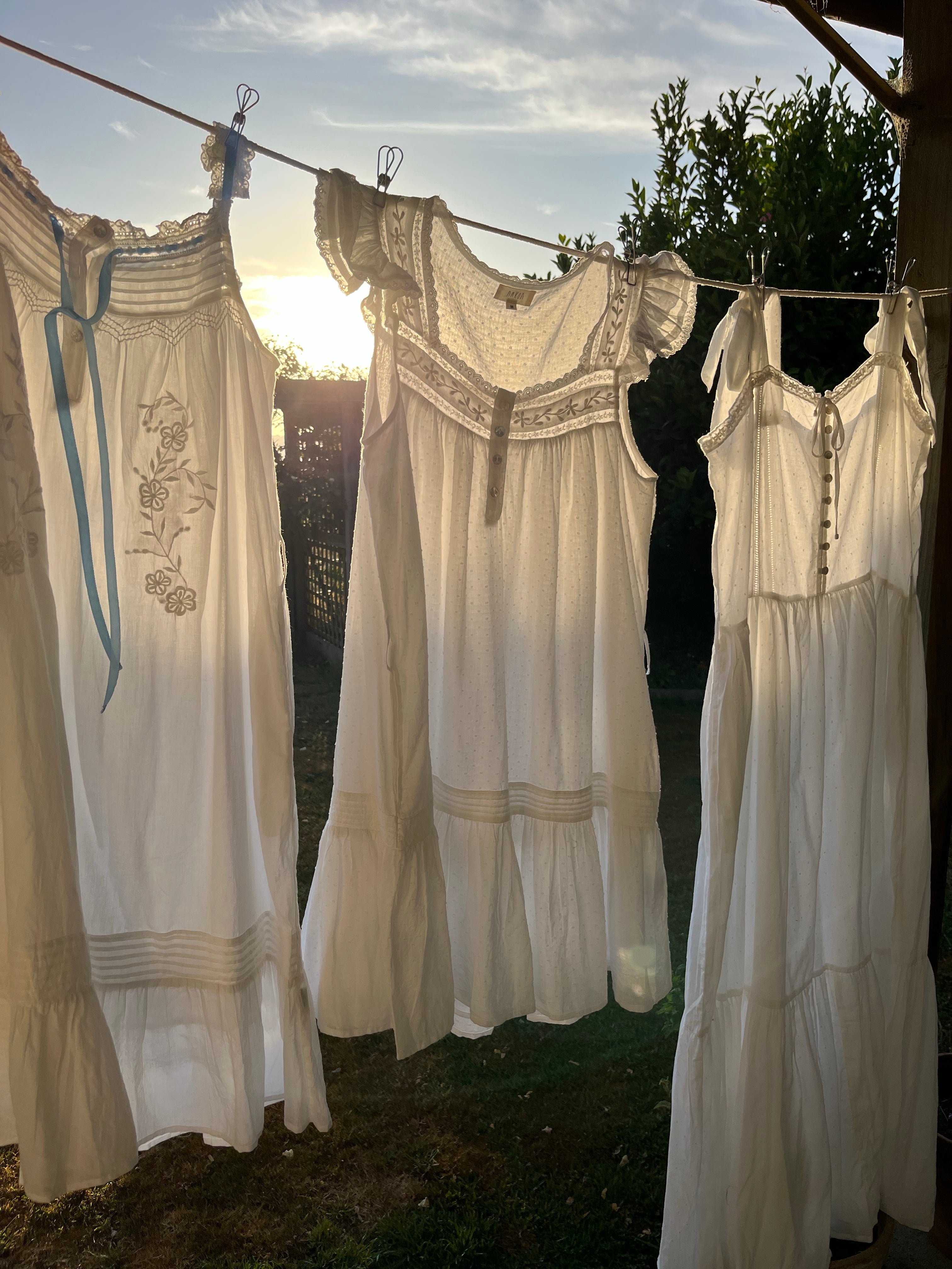 The dreamiest of dresses, made for wandering the garden in the sunshine and picnics under apple trees. Beautifully soft with feminine lace detailing and a long flowing silhouette. Featuring cotton lace, tie straps and a functional button opening, perfect for breastfeeding.