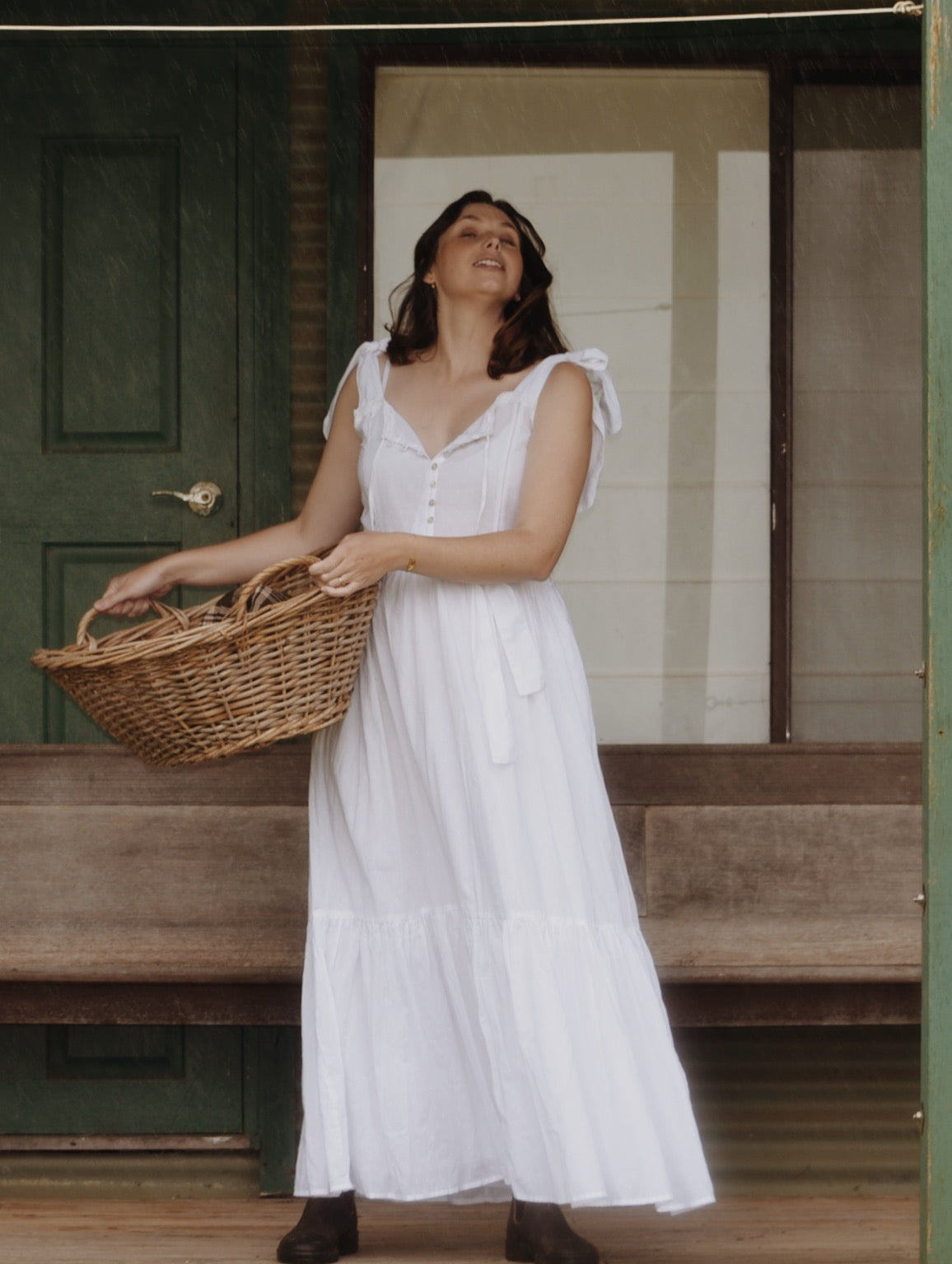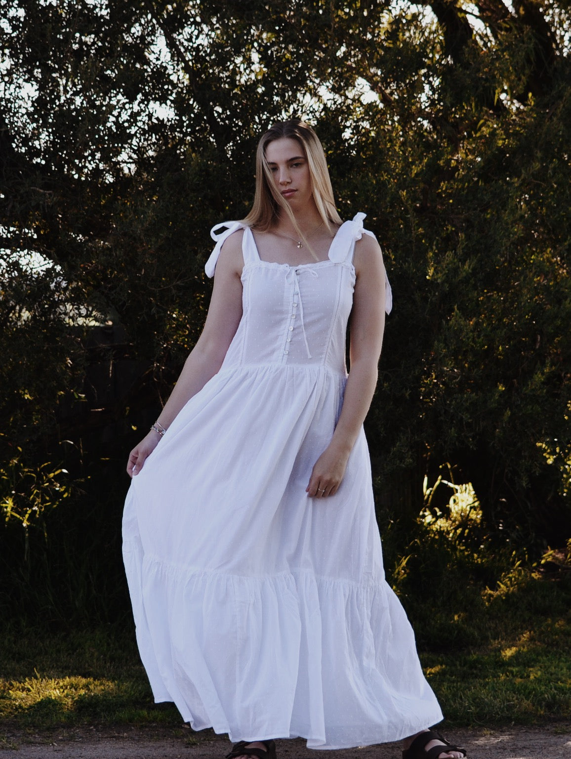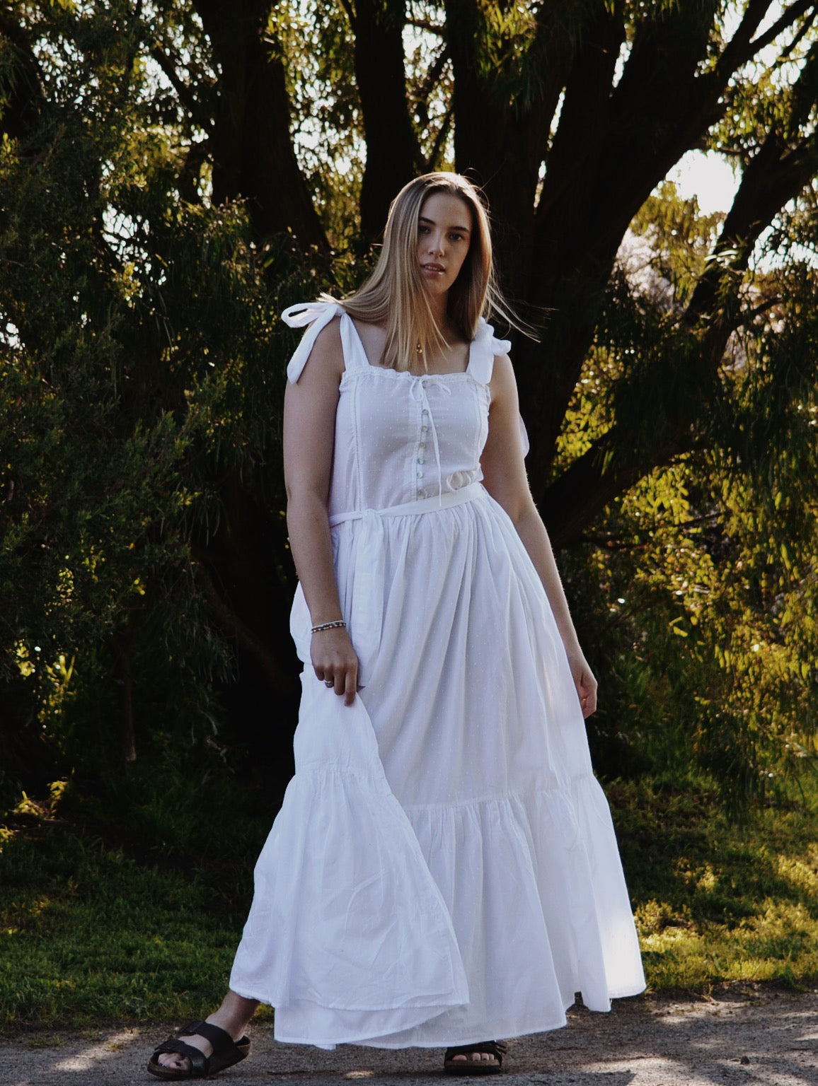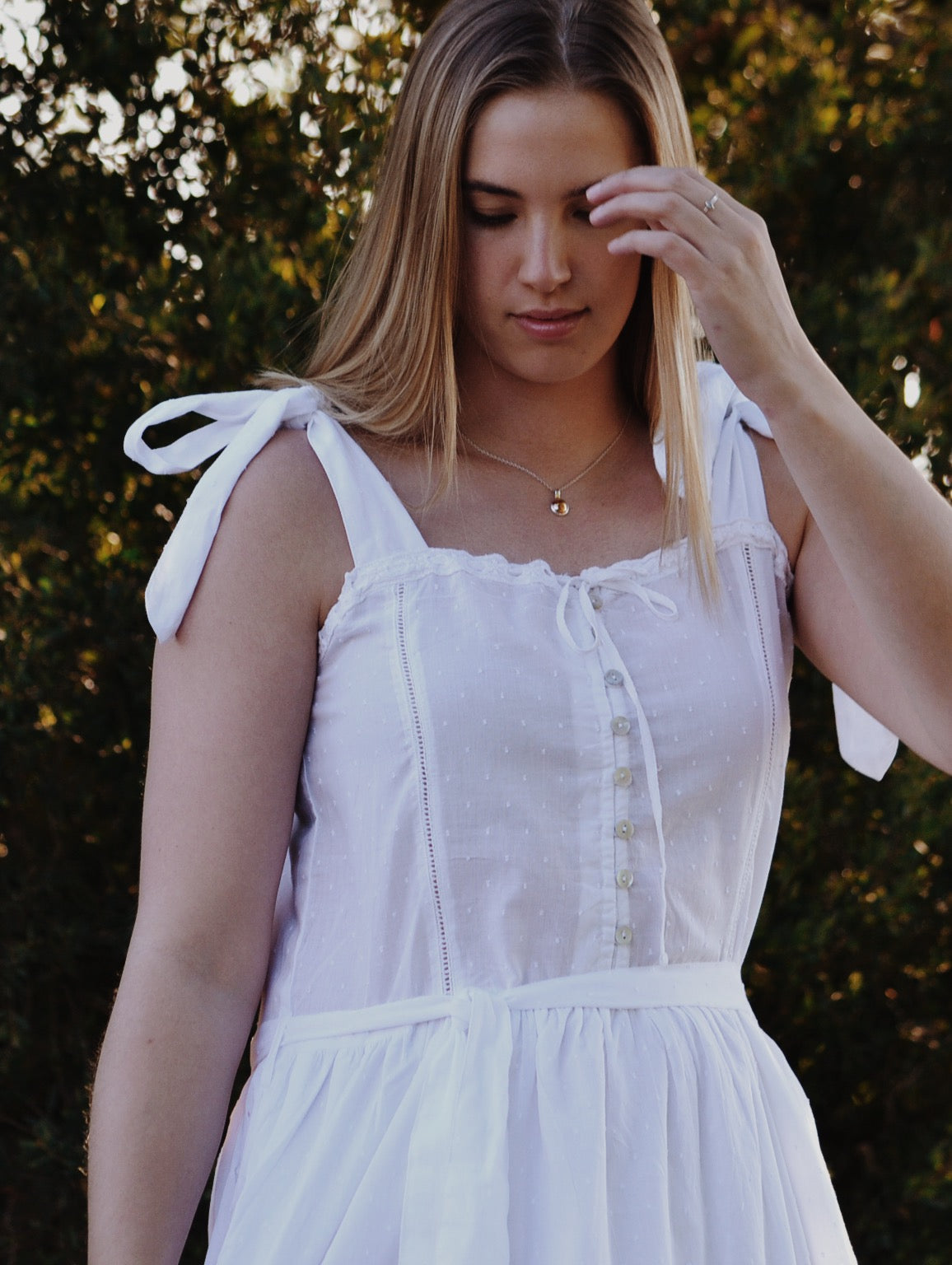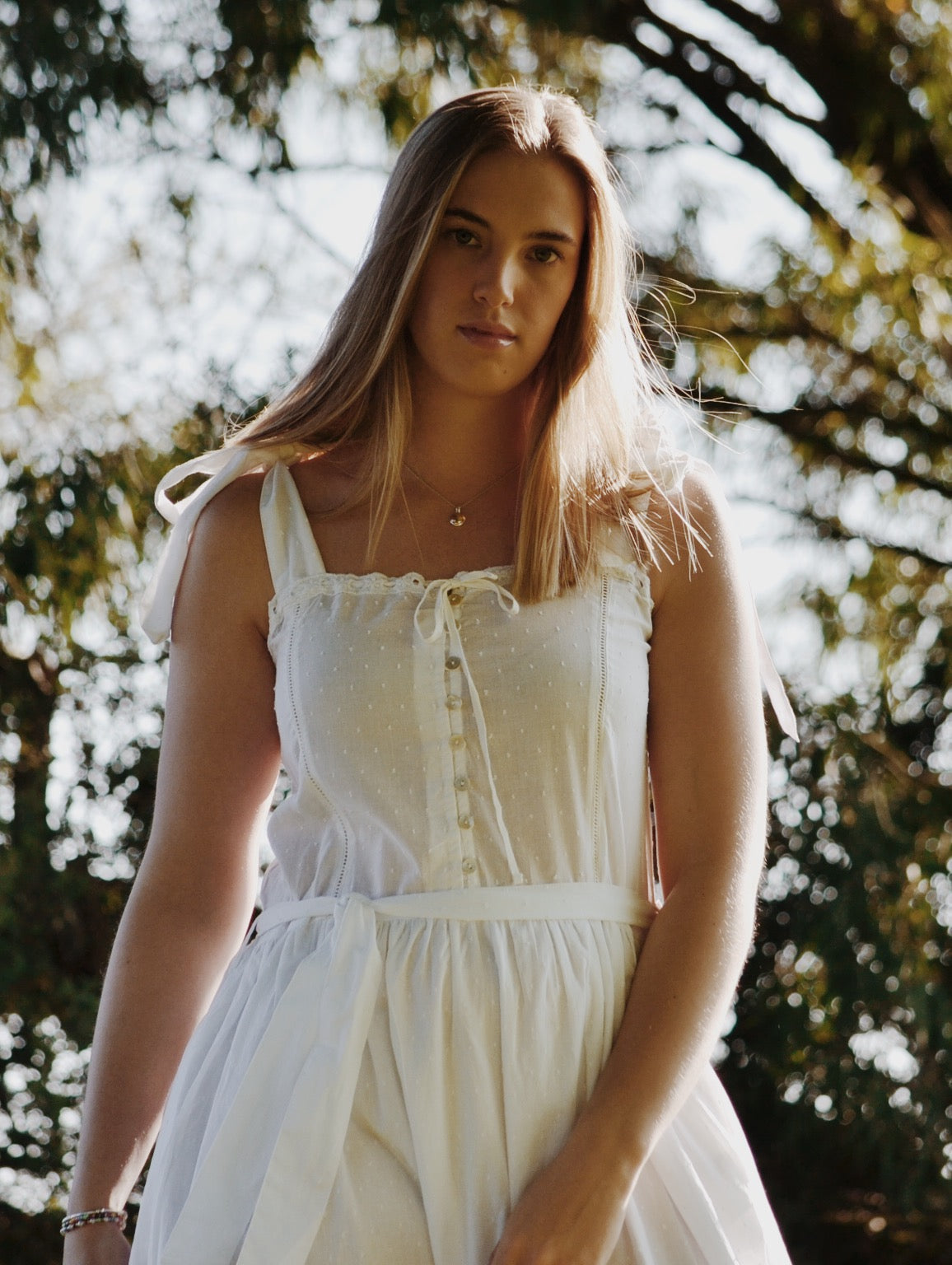The dreamiest of dresses, made for wandering the garden in the sunshine and picnics under apple trees. Beautifully soft with feminine lace detailing and a long flowing silhouette. Featuring cotton lace, tie straps and a functional button opening, perfect for breastfeeding.