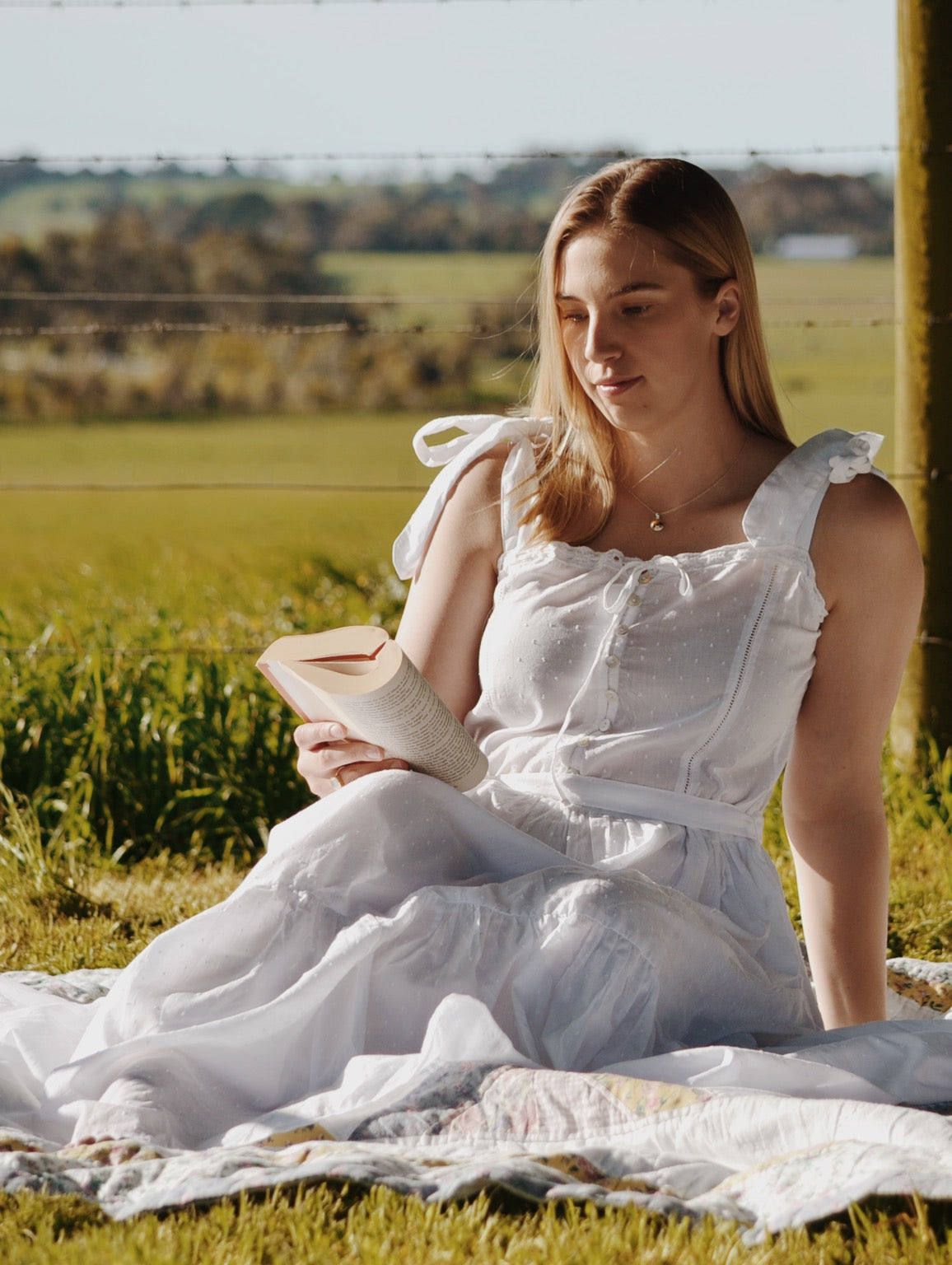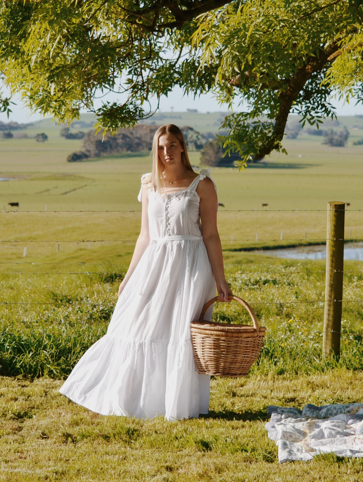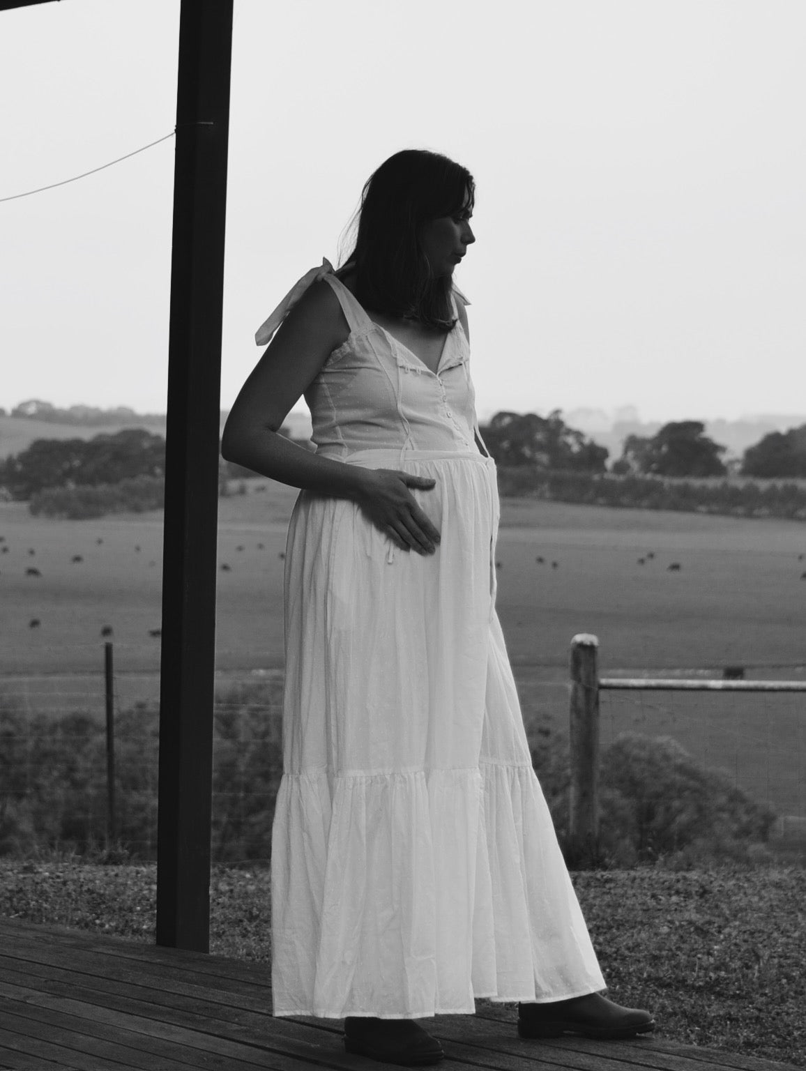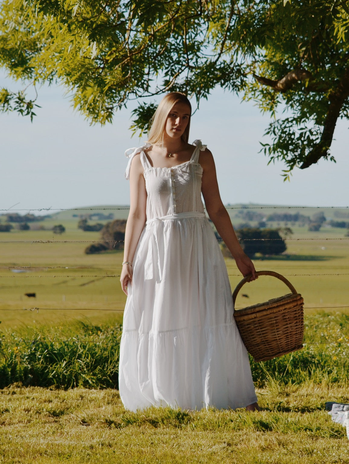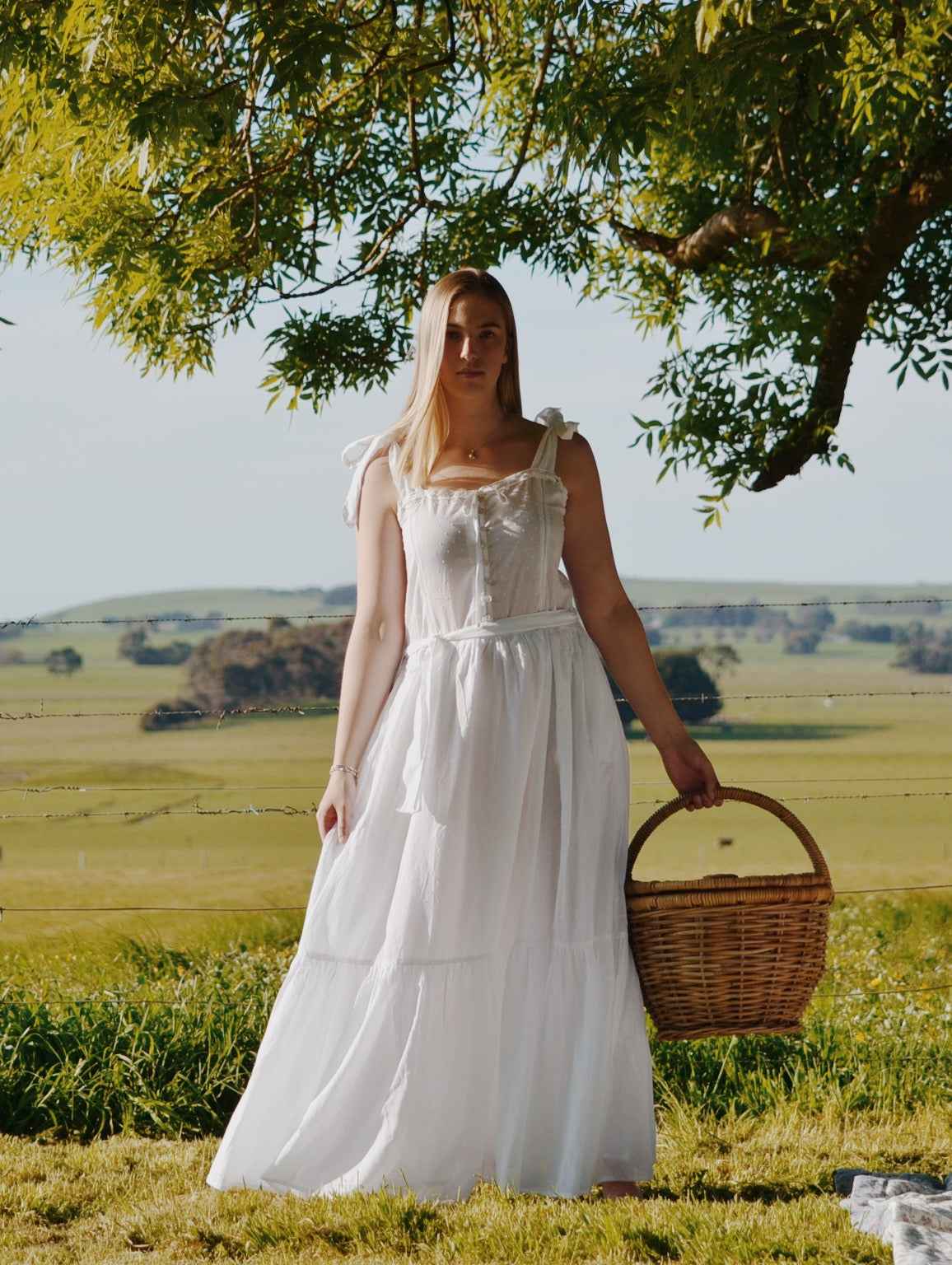 The dreamiest of dresses, made for wandering the garden in the sunshine and picnics under apple trees. Beautifully soft with feminine lace detailing and a long flowing silhouette. Featuring cotton lace, tie straps and a functional button opening, perfect for breastfeeding.