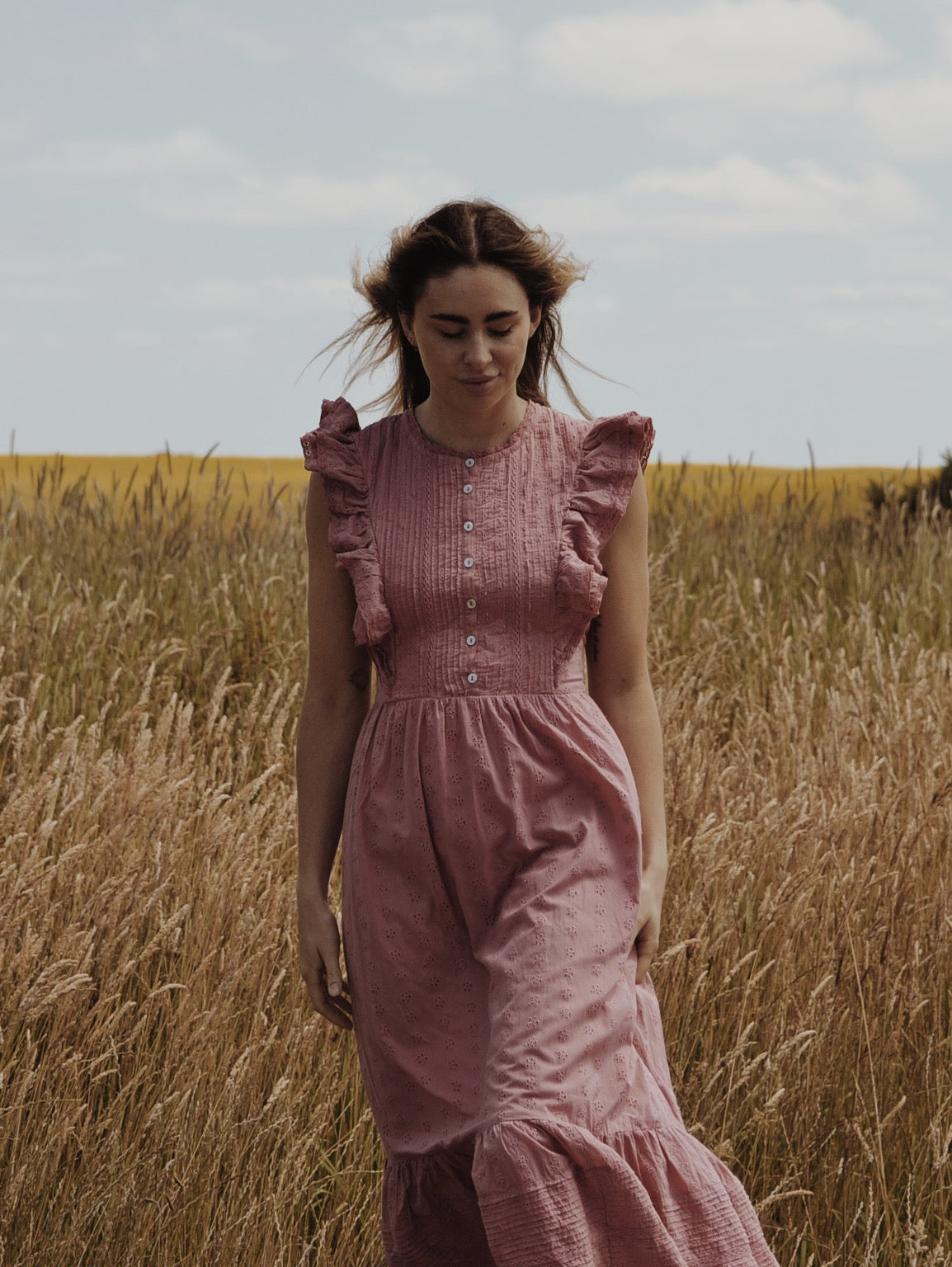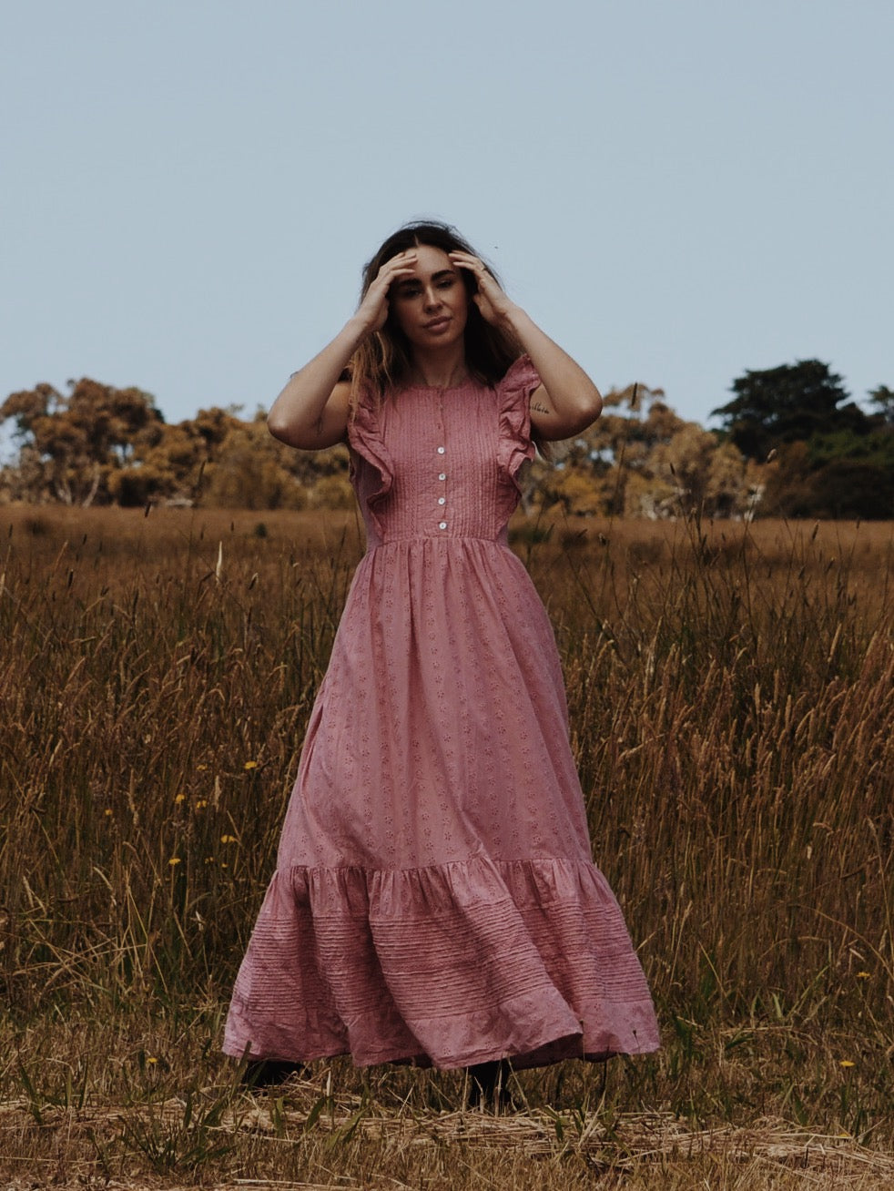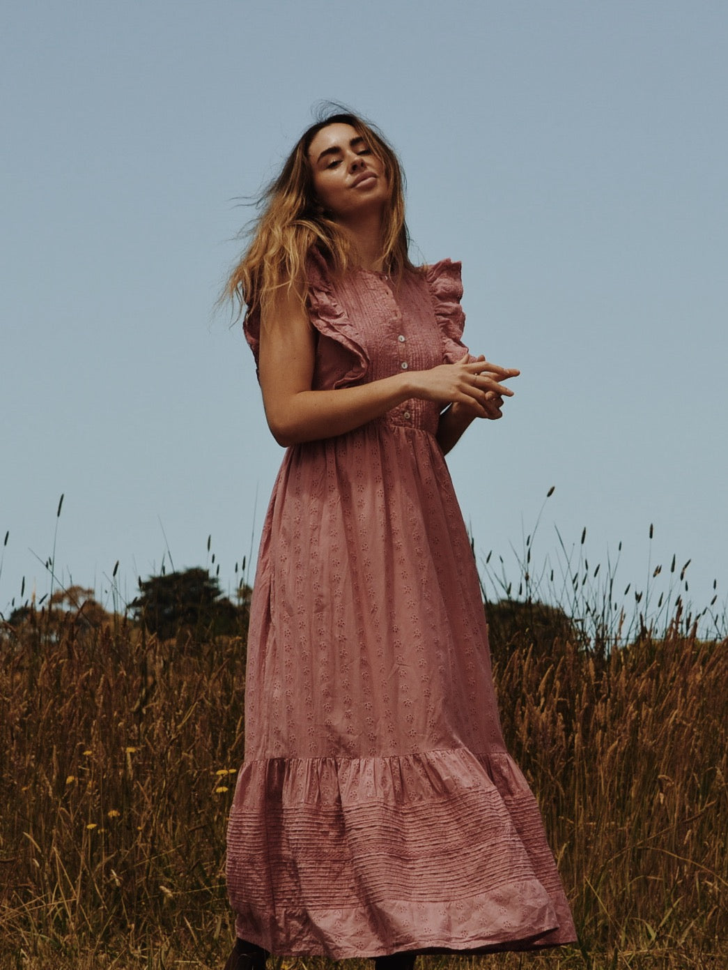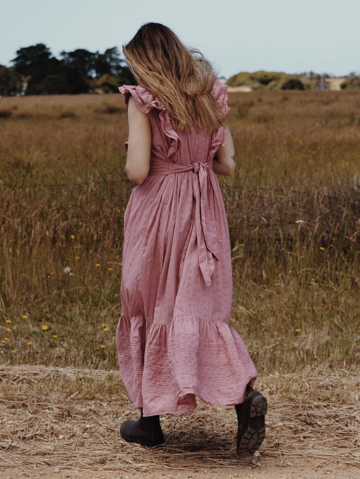 The absolute dreamiest of dresses, you might just hang her over the front of your wardrobe to swoon over, she's so pretty. Whether you're wandering the garden or dancing at an afternoon soiree, this dress will have you floating through the day. Made in a light cotton with small embroidered flowers dotted throughout. The ruffled sleeves, pintuck detailing and lace inserts are beautifully feminine featuring in the bodice and tiered lower skirt. A sash tie features along the back, flowing through to a figure flattering long gathered skirt length.