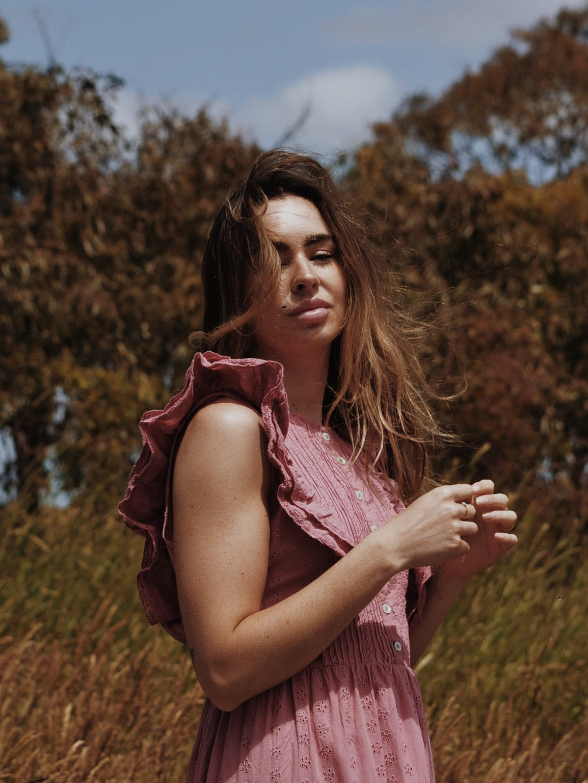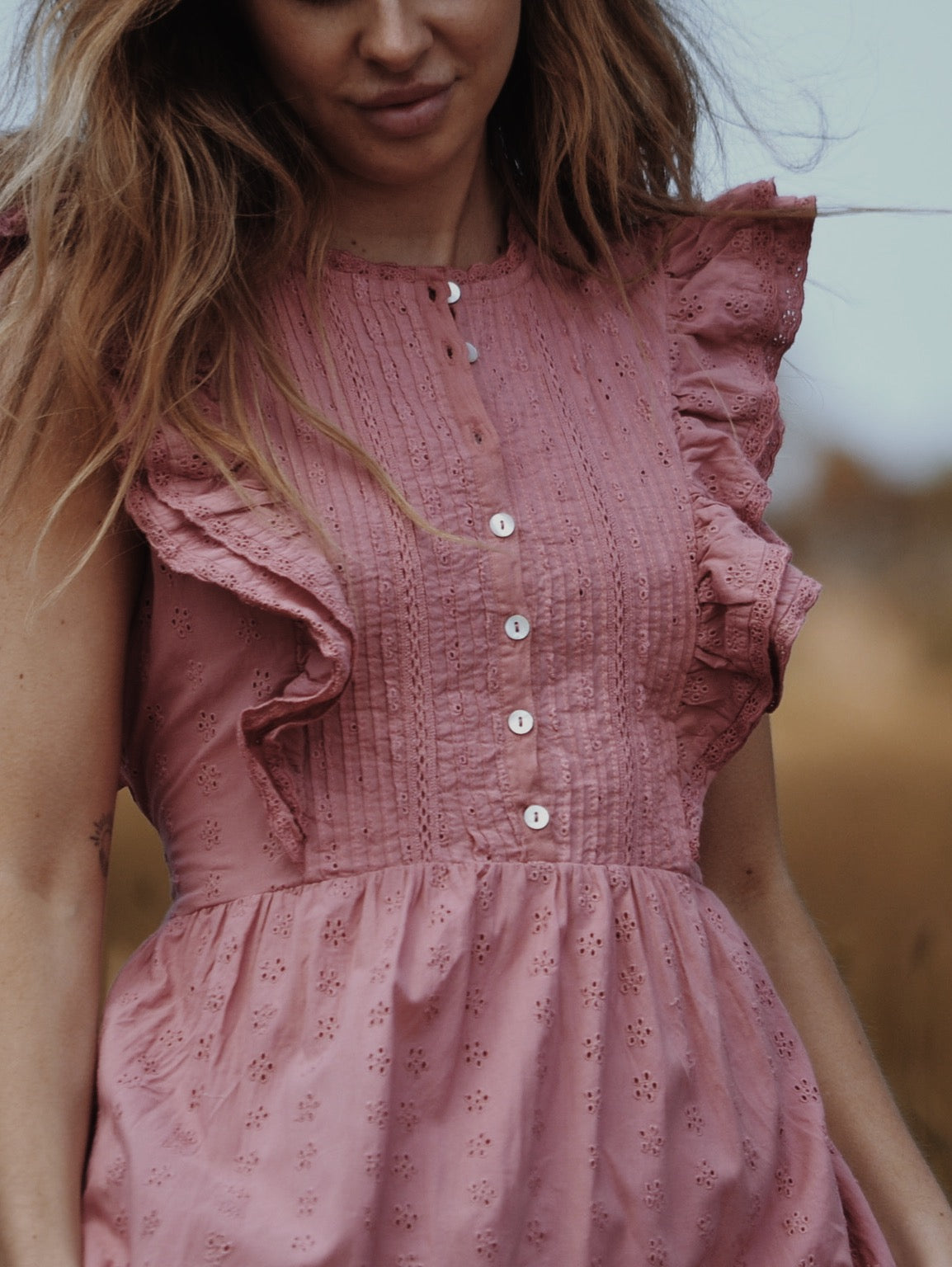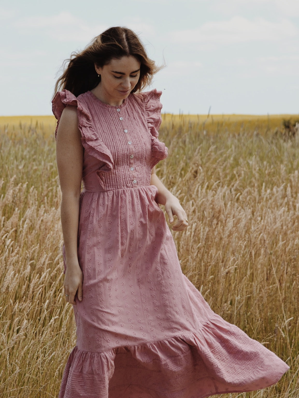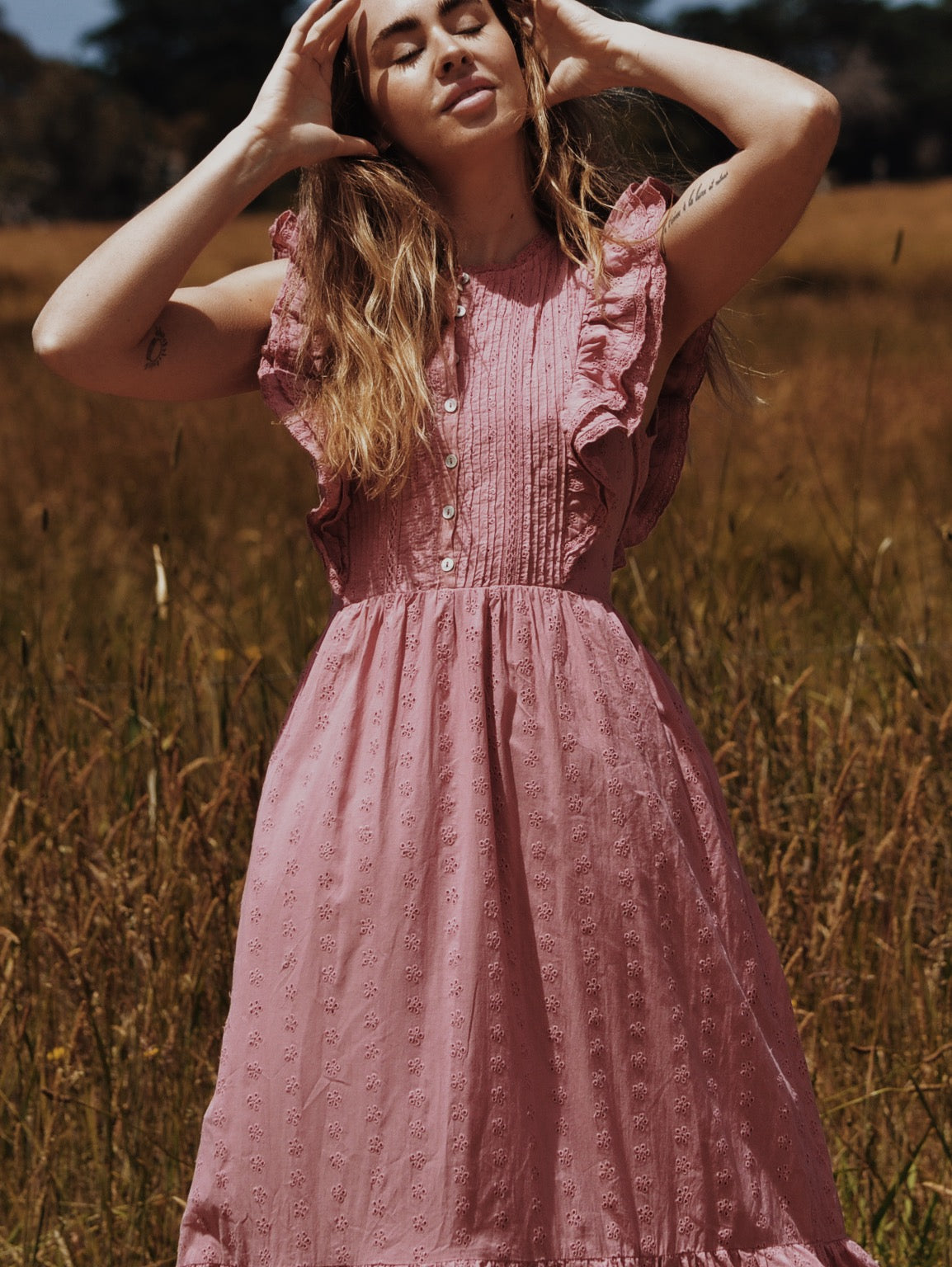 The absolute dreamiest of dresses, you might just hang her over the front of your wardrobe to swoon over, she's so pretty. Whether you're wandering the garden or dancing at an afternoon soiree, this dress will have you floating through the day. Made in a light cotton with small embroidered flowers dotted throughout. The ruffled sleeves, pintuck detailing and lace inserts are beautifully feminine featuring in the bodice and tiered lower skirt. A sash tie features along the back, flowing through to a figure flattering long gathered skirt length.