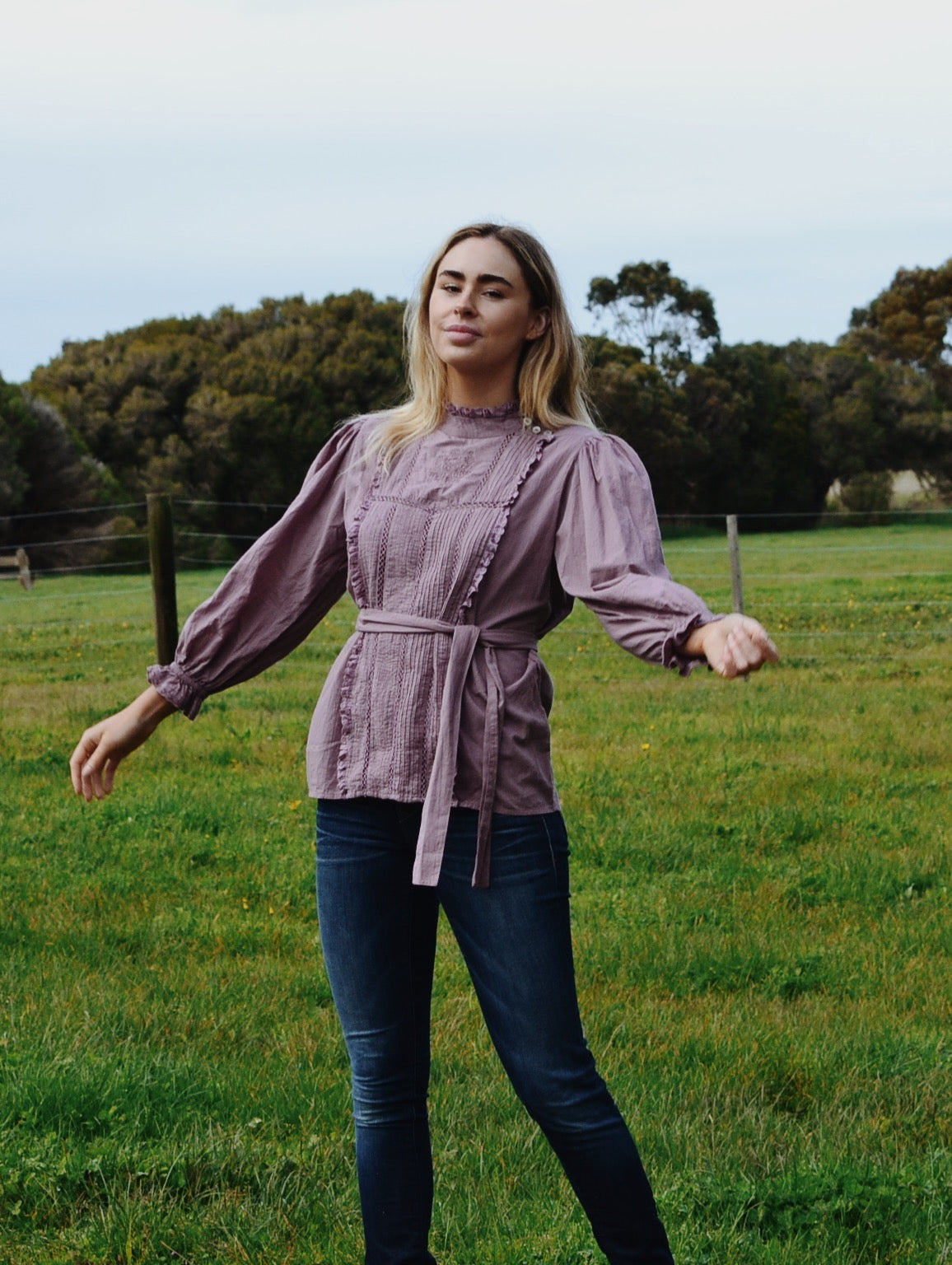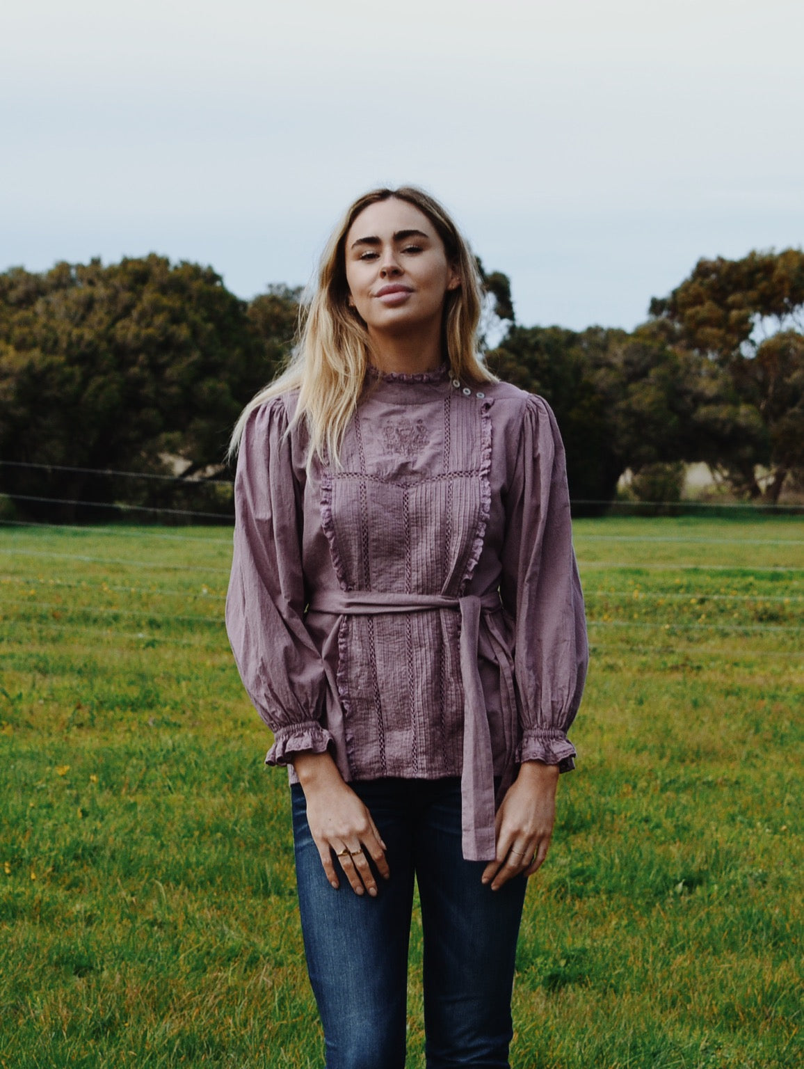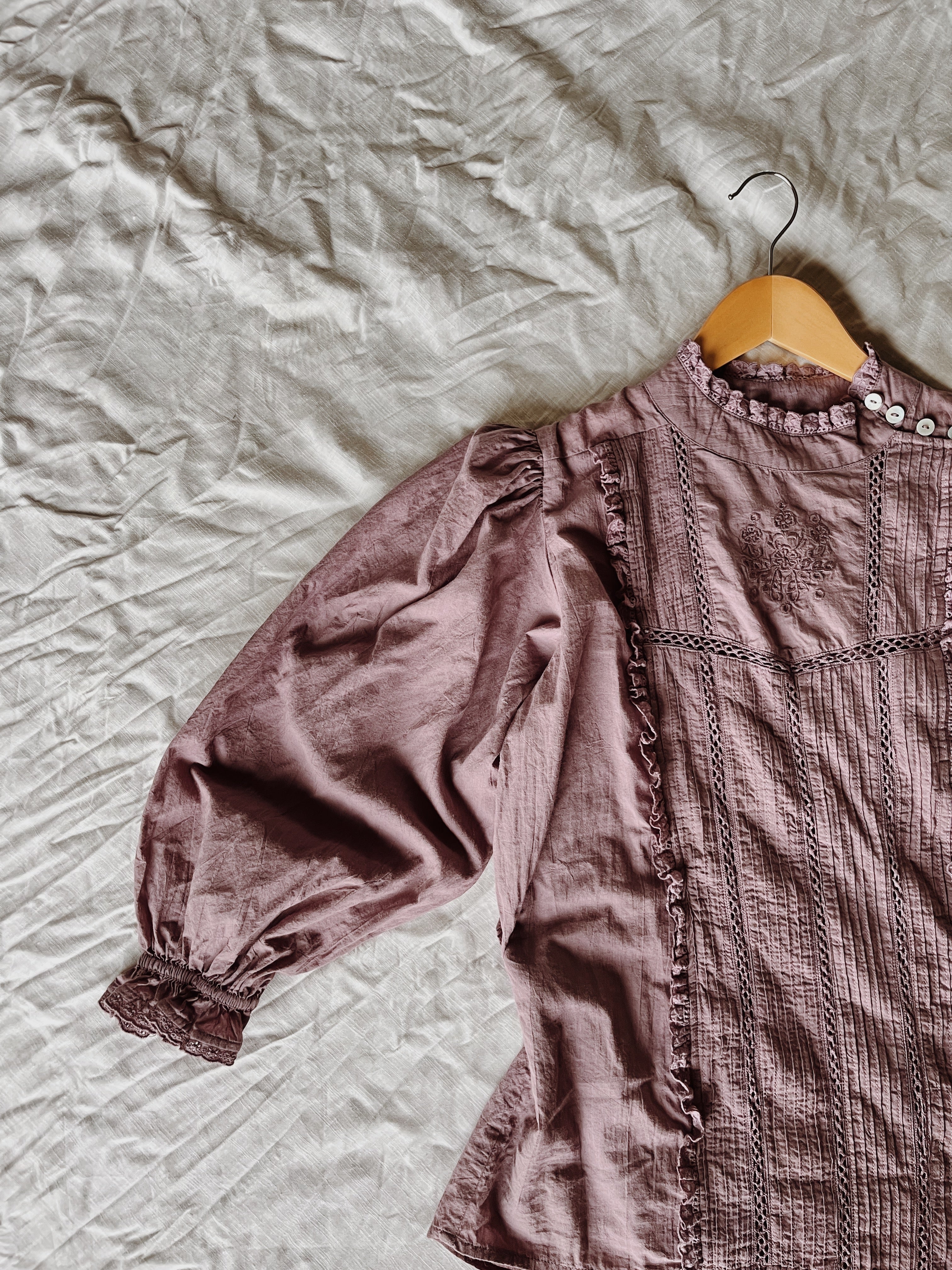 A classic blouse you will treasure, made for slow days spent wandering in a reverie. This beauty will take you to a time and place far away. Little nods to nostalgia include the Edwardian inspired high neckline with gathers, lace detailing, pin tucks and a beautiful embroidered feature.