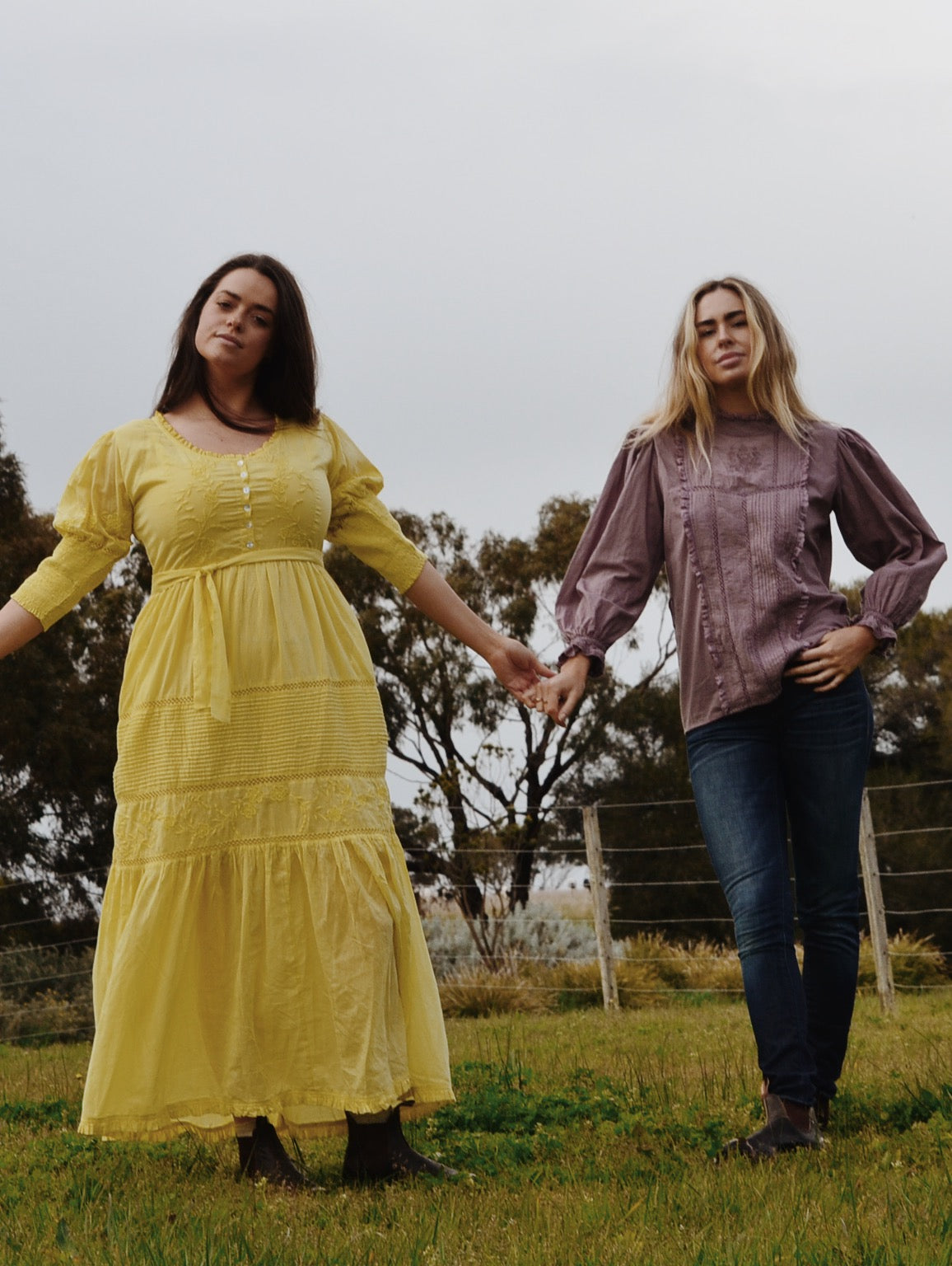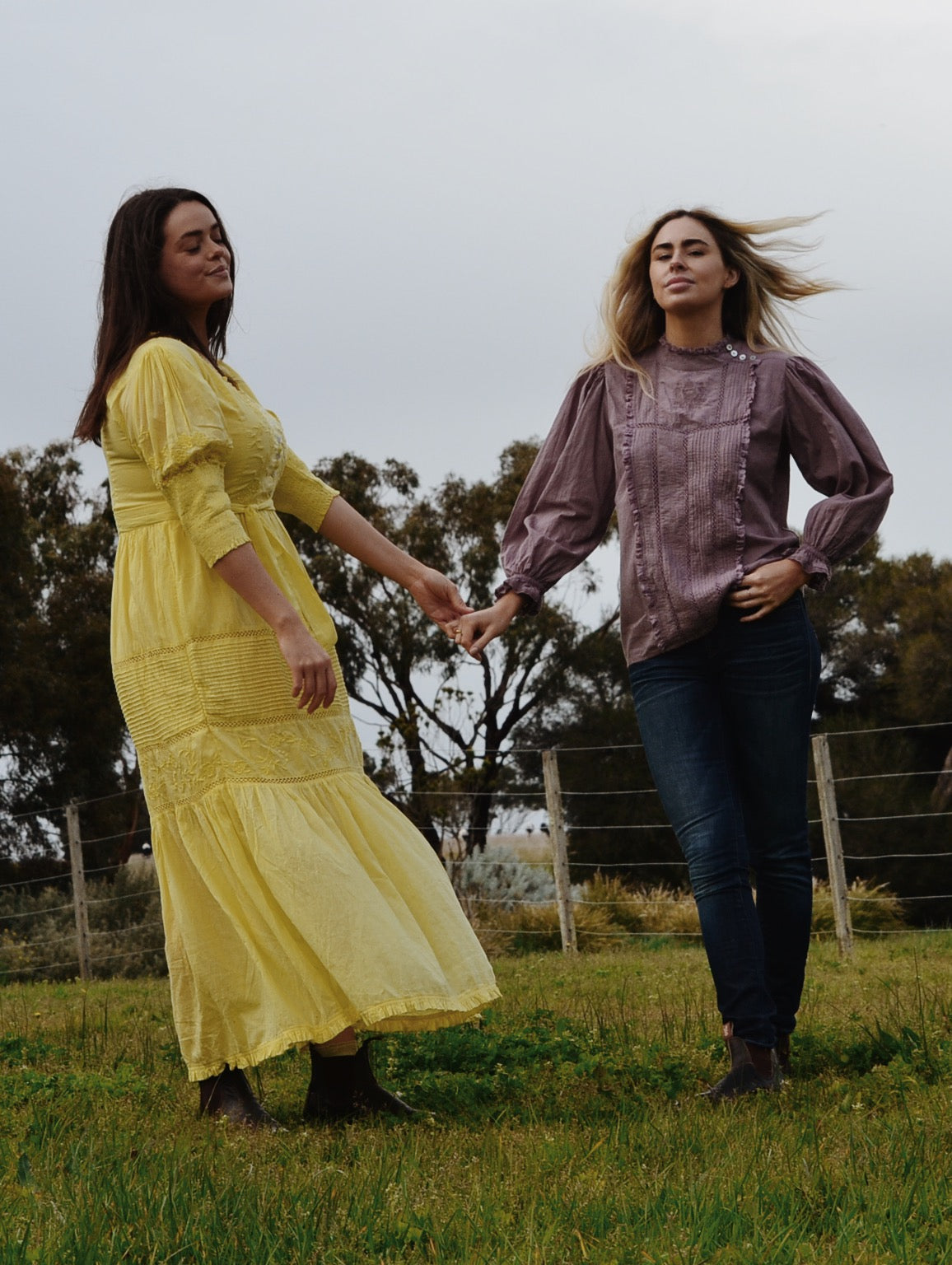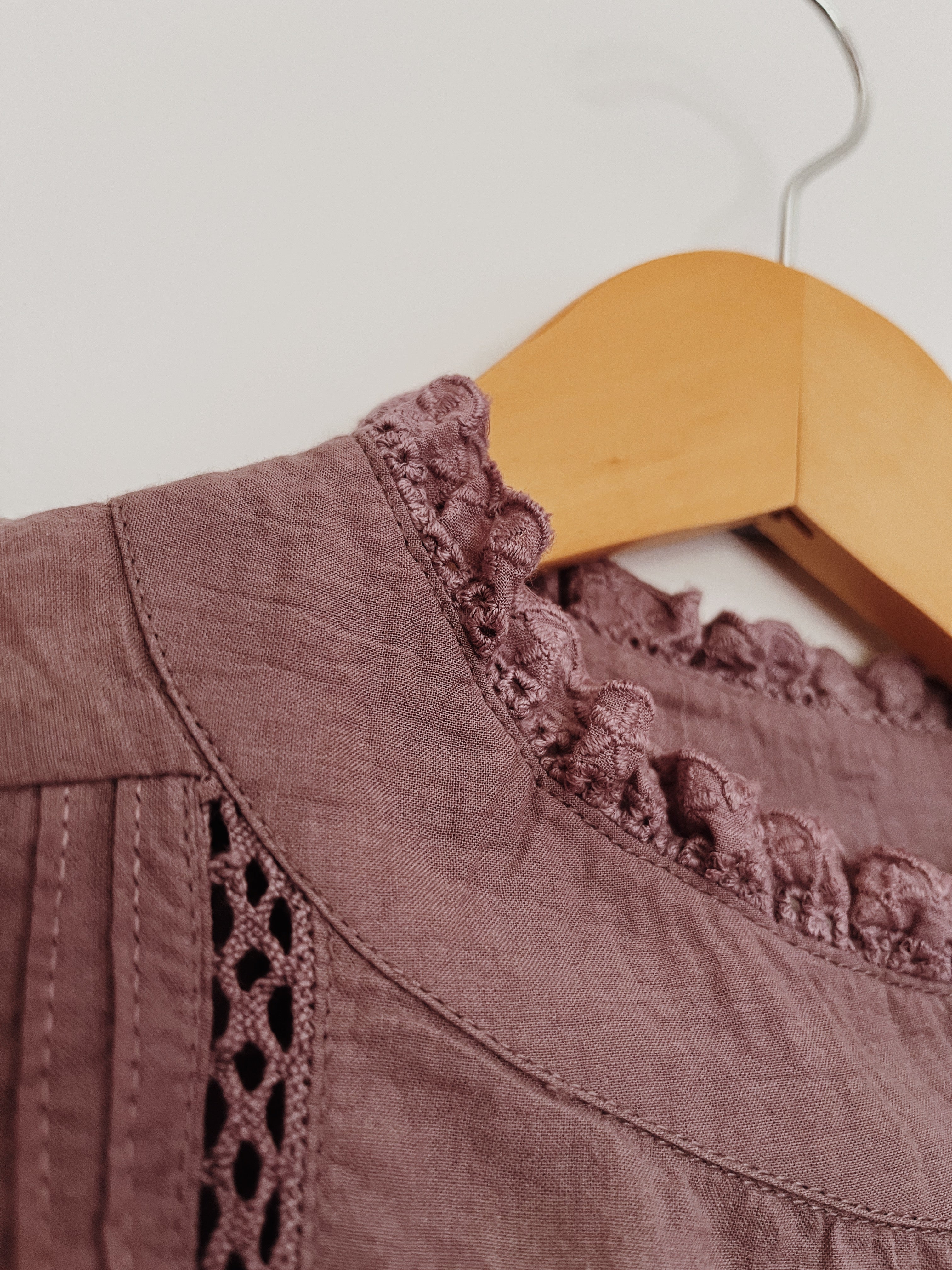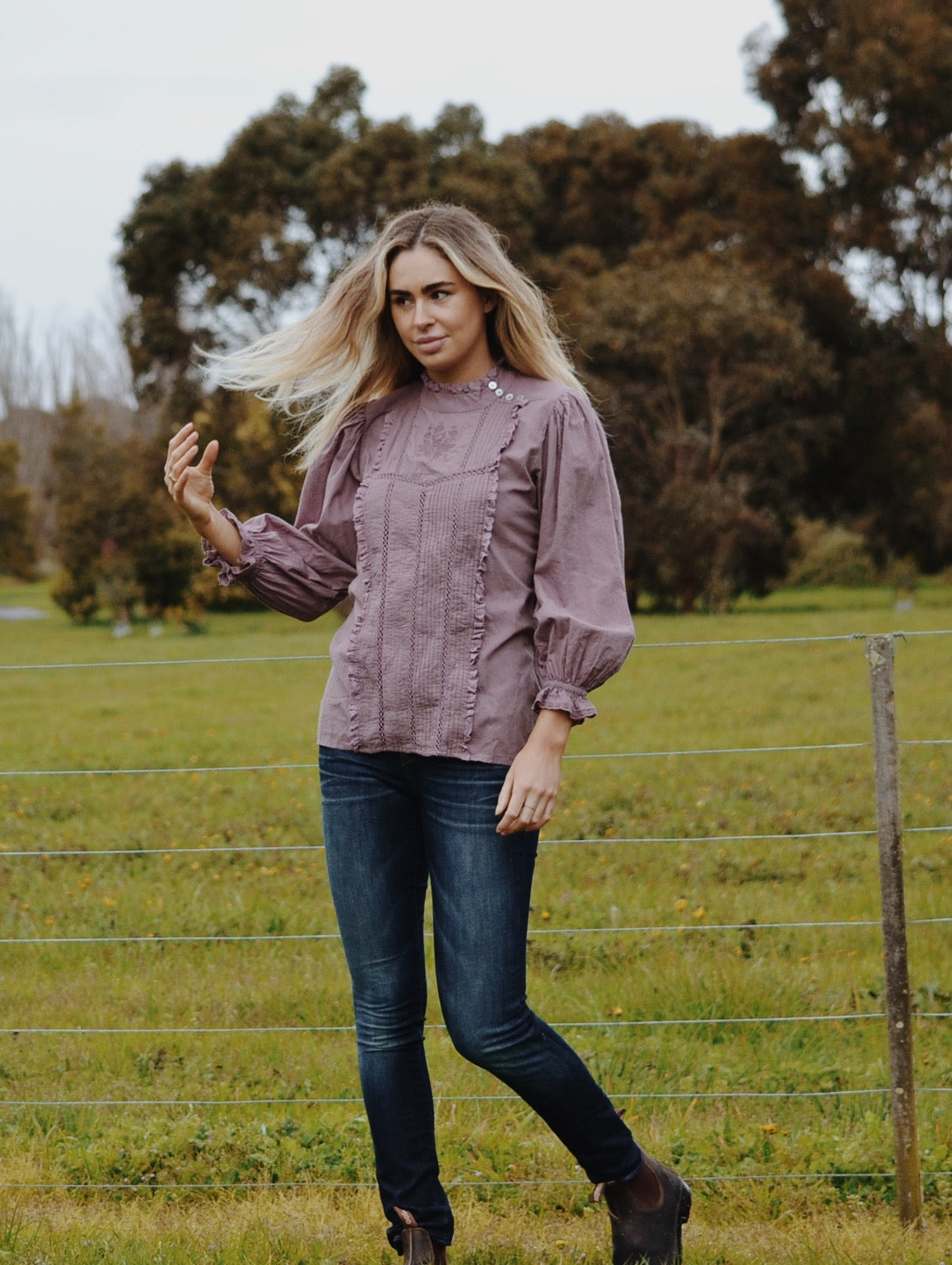 A classic blouse you will treasure, made for slow days spent wandering in a reverie. This beauty will take you to a time and place far away. Little nods to nostalgia include the Edwardian inspired high neckline with gathers, lace detailing, pin tucks and a beautiful embroidered feature.