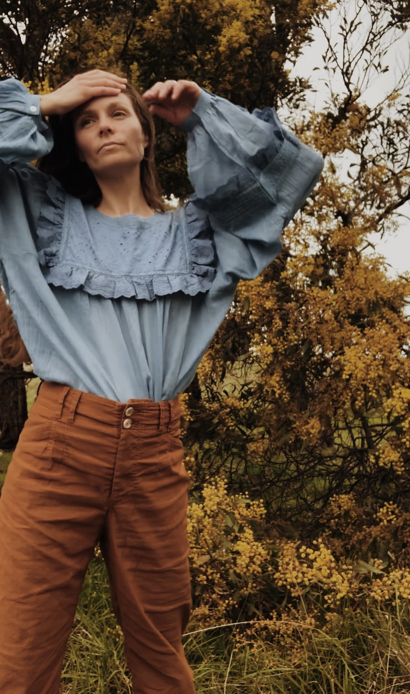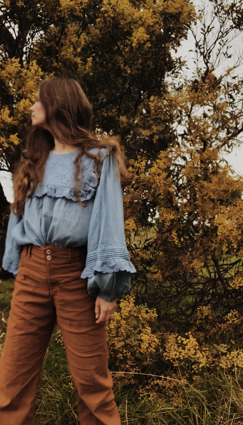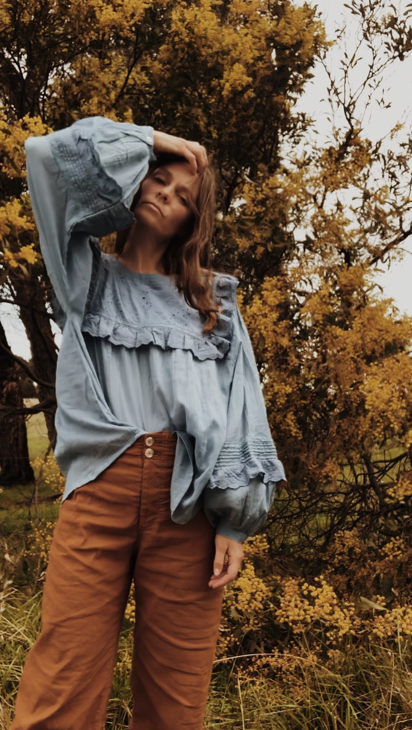 100% cotton. The dreamiest of blouses, made in super soft, lightweight cotton gauze. Beautifully floaty with billowing sleeves, wear loose or tucked in to add shape. Featuring a frilled, embroidered cotton yoke with detailing on the sleeve. This blouse is so soft and feminine, perfect for garden wandering and daydreaming.