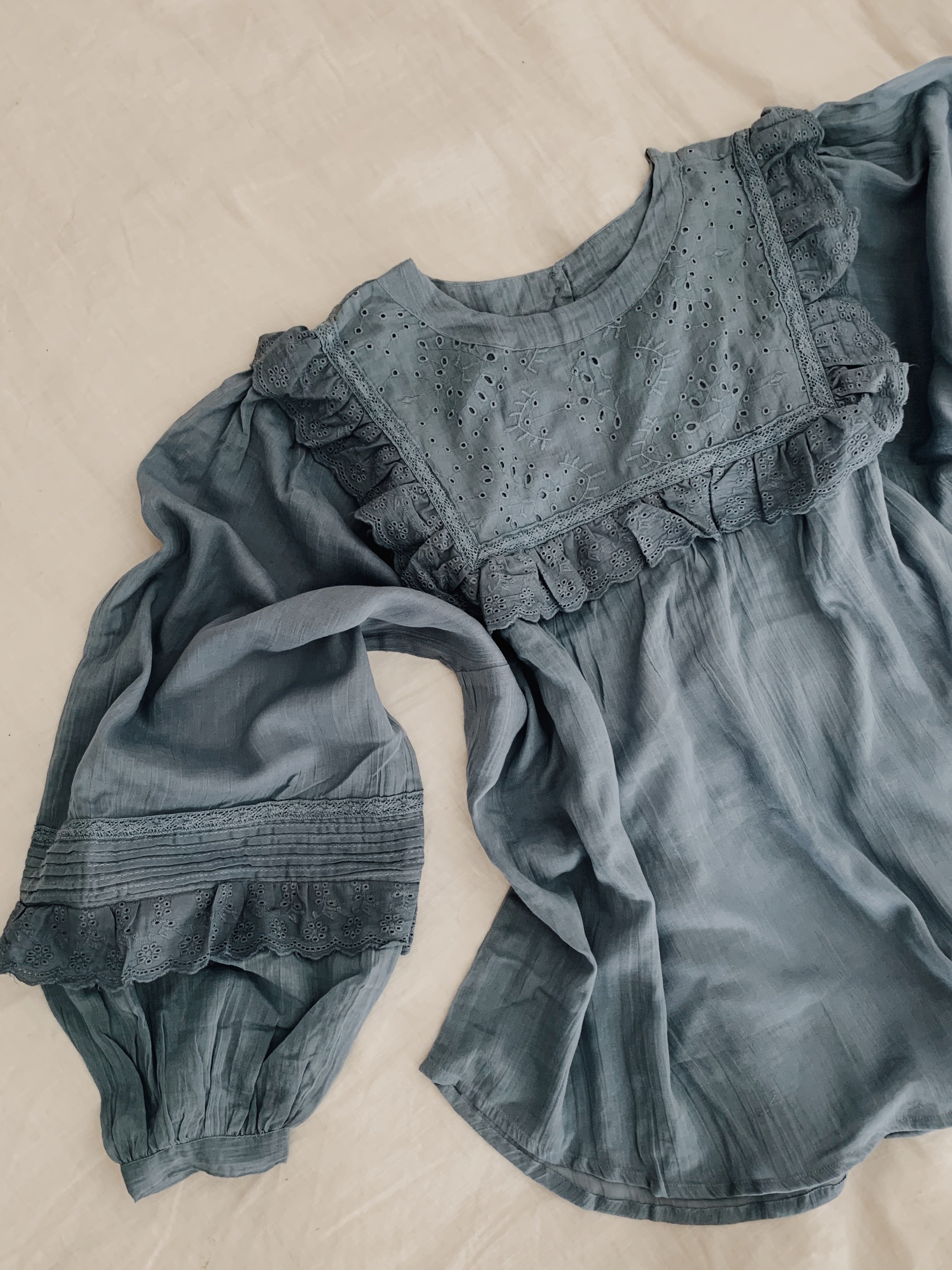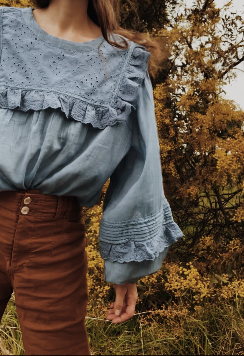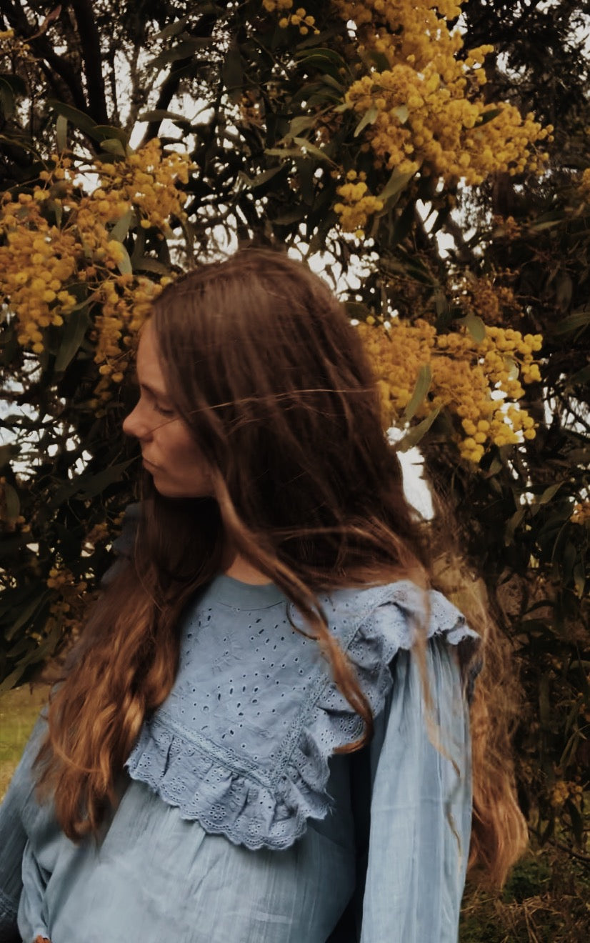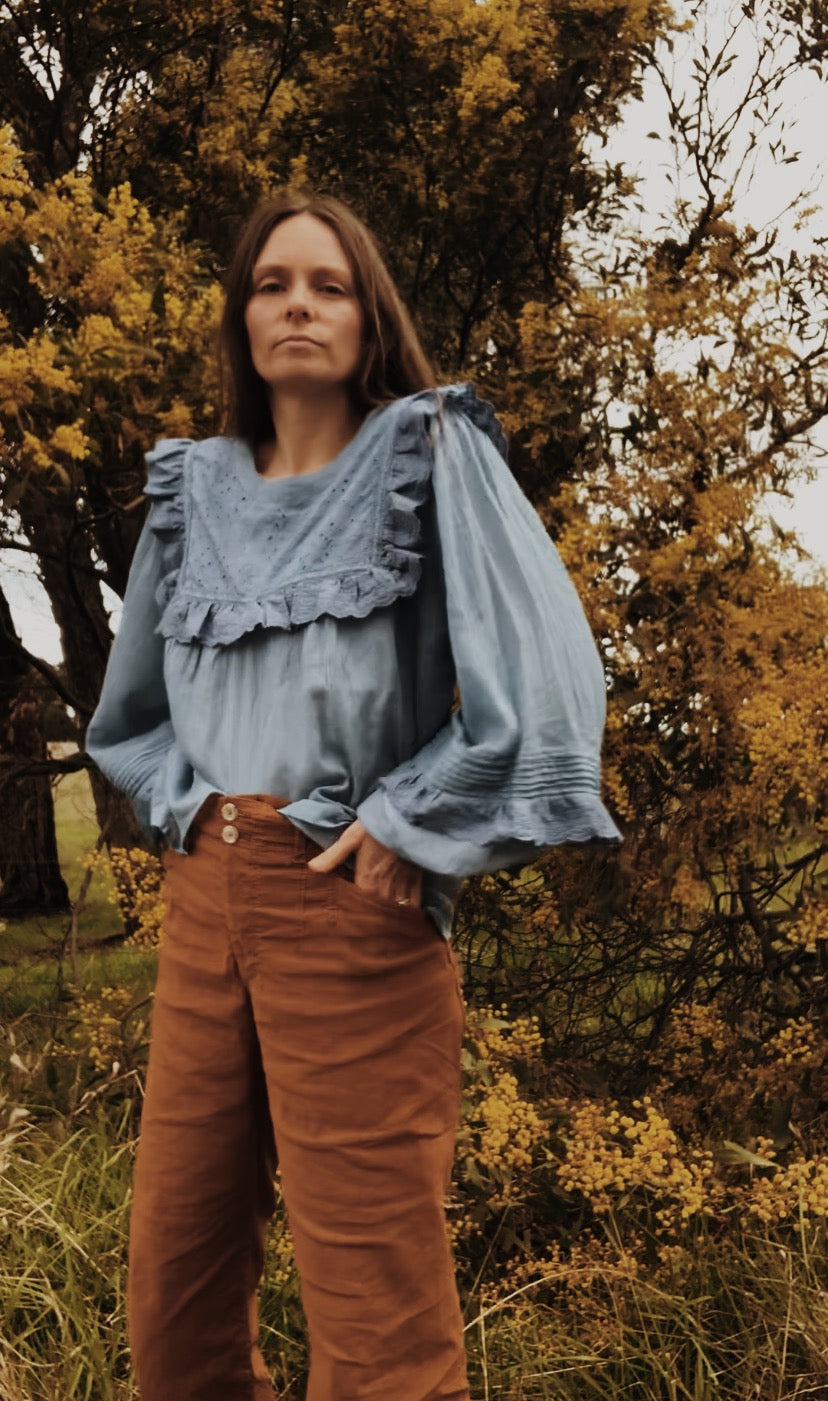 100% cotton. The dreamiest of blouses, made in super soft, lightweight cotton gauze. Beautifully floaty with billowing sleeves, wear loose or tucked in to add shape. Featuring a frilled, embroidered cotton yoke with detailing on the sleeve. This blouse is so soft and feminine, perfect for garden wandering and daydreaming.