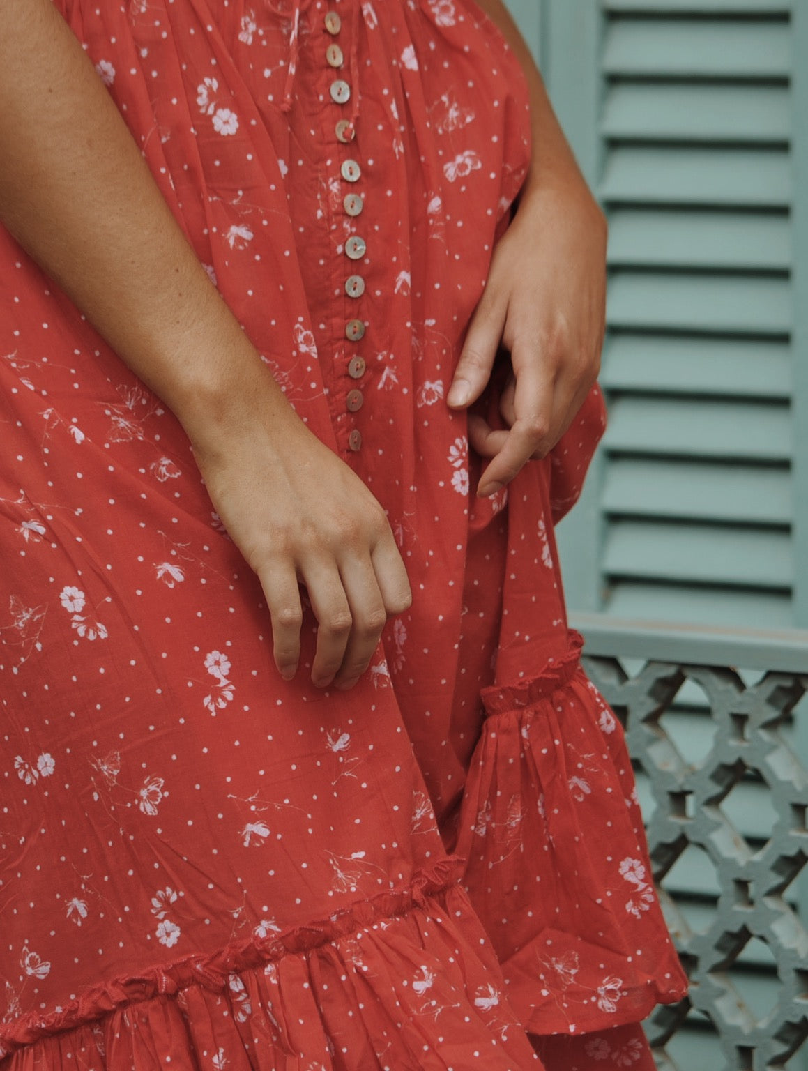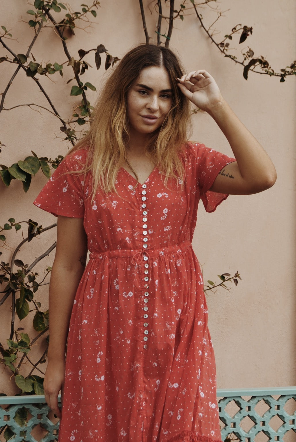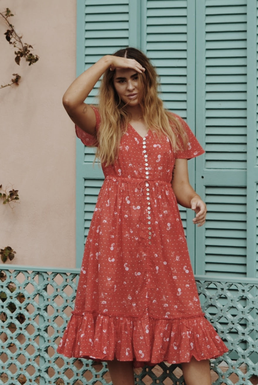 100% Cotton. This beautiful, breezy style will have you in twirls. An easy, relaxed style dress you can throw on effortlessly and feel feminine. The flattering silhouette will suit most body shapes and cinches at the waist with an adjustable drawstring waist. Inspired by dresses of times gone by, you can't help but feel a sense of nostalgia in this classic style. Light and cool to wear, just as perfect for picnics barefoot by the creek as it is for romantic dinners. Made in a custom cosmos floral print.