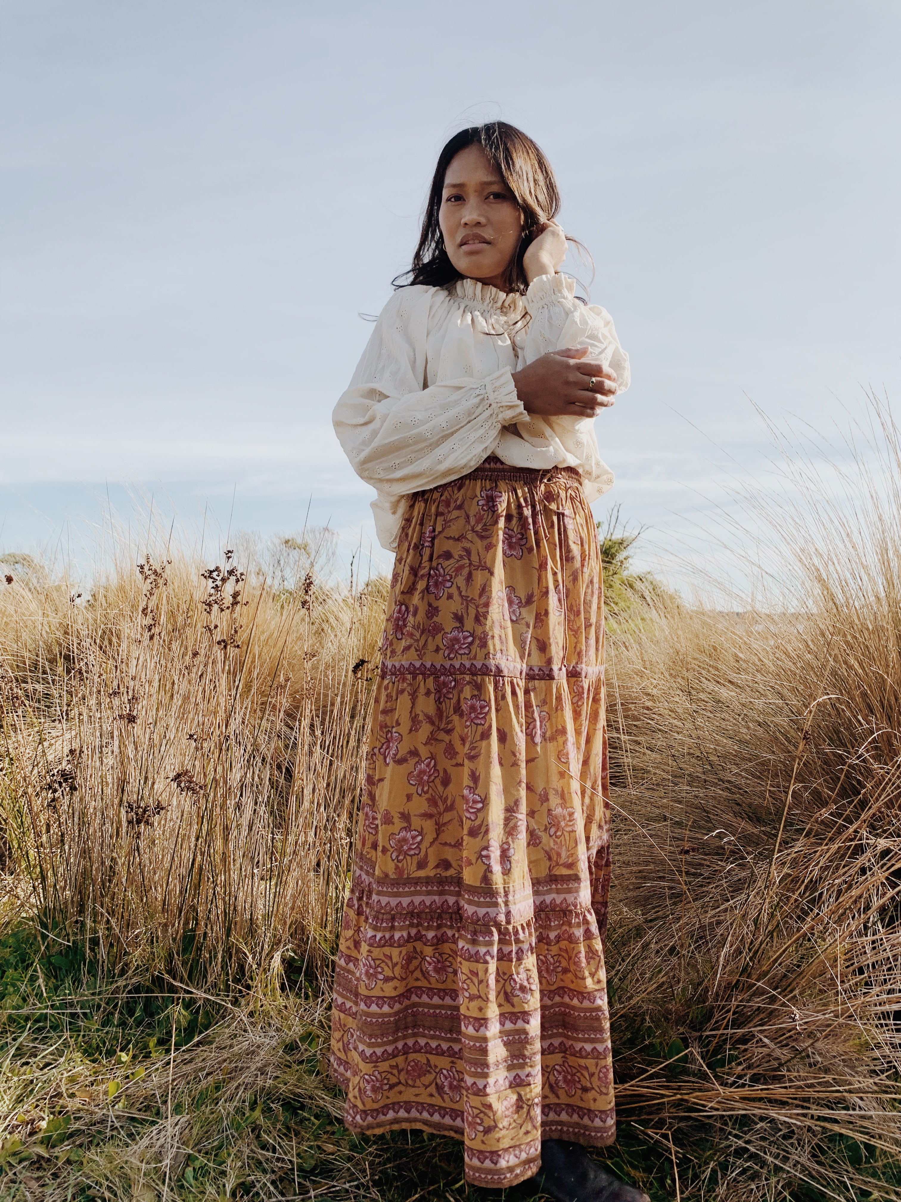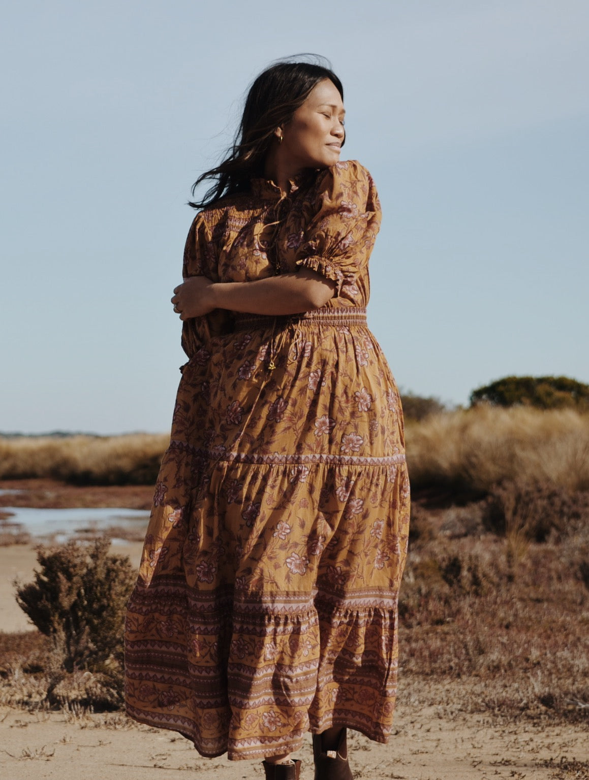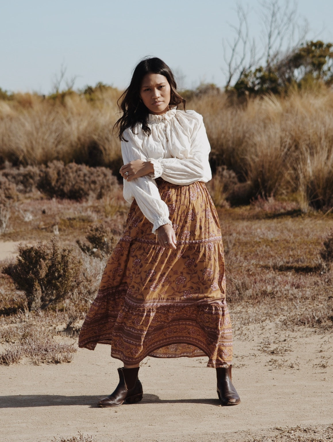 100% cotton. Elegantly bohemian, a beautifully floaty style that can be worn casually wandering barefoot, or also has a slightly dressier edge in it's detailing, perfect for easy layering. The elastic waist of the skirt can be cinched further with a tie which flows through to breezy, figure flattering tiers. Made in a custom hand gouache painted itch peony print only made in a very limited cut.