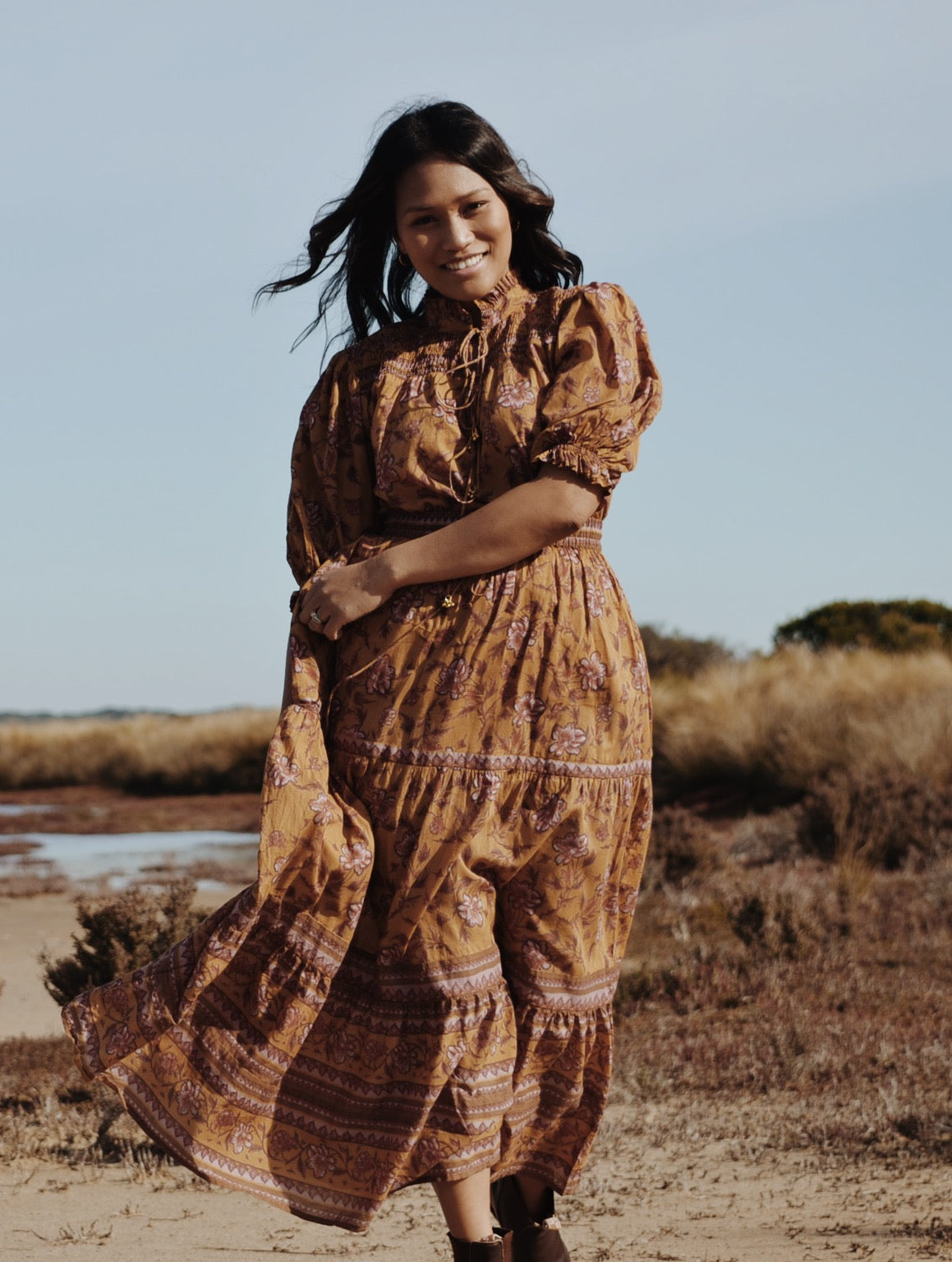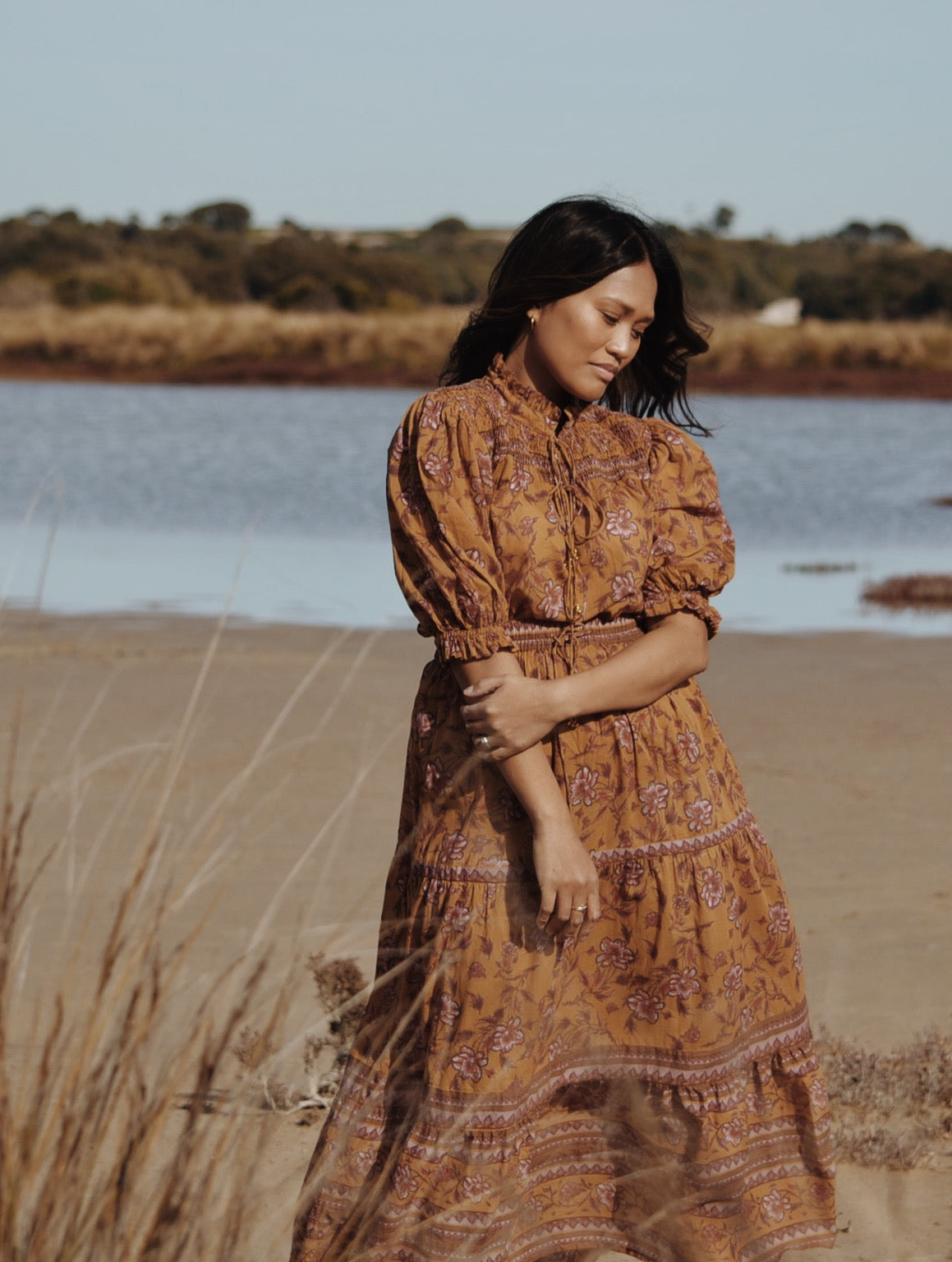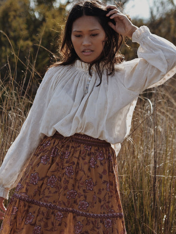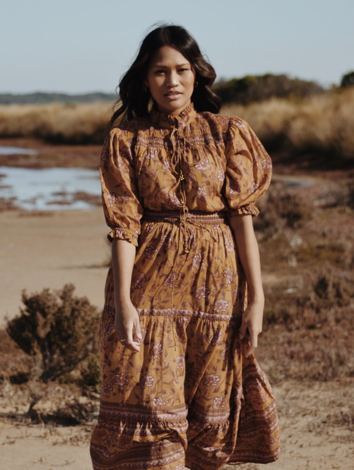 100% cotton. Elegantly bohemian, a beautifully floaty style that can be worn casually wandering barefoot, or also has a slightly dressier edge in it's detailing, perfect for easy layering. The elastic waist of the skirt can be cinched further with a tie which flows through to breezy, figure flattering tiers. Made in a custom hand gouache painted itch peony print only made in a very limited cut.