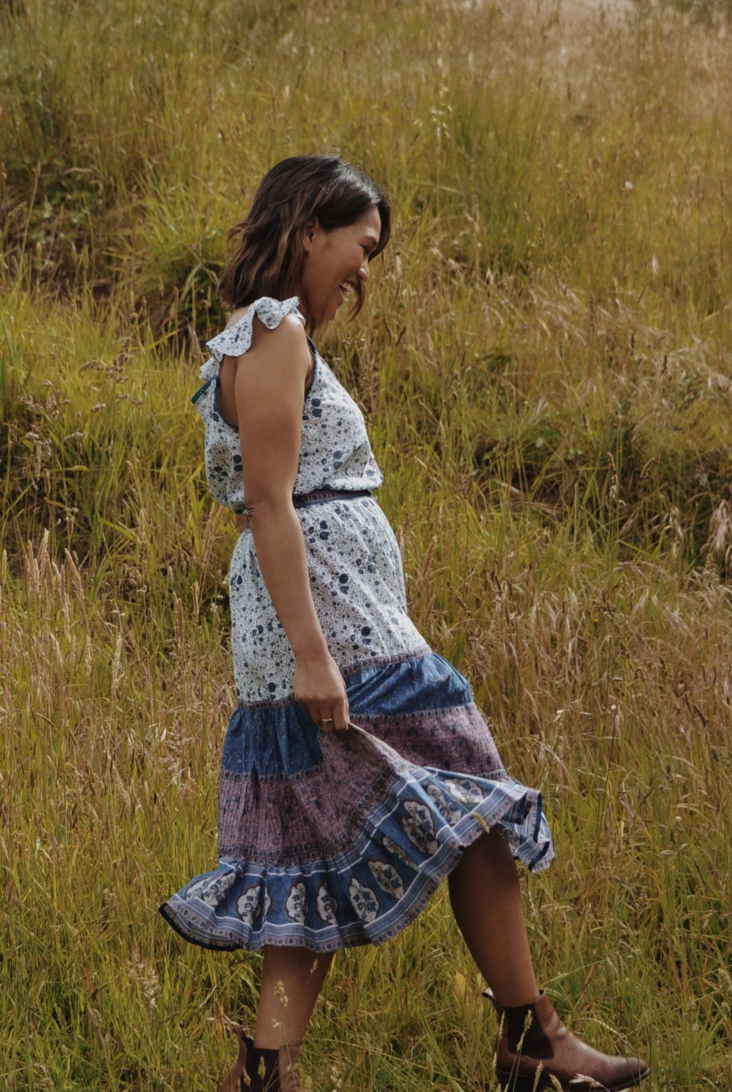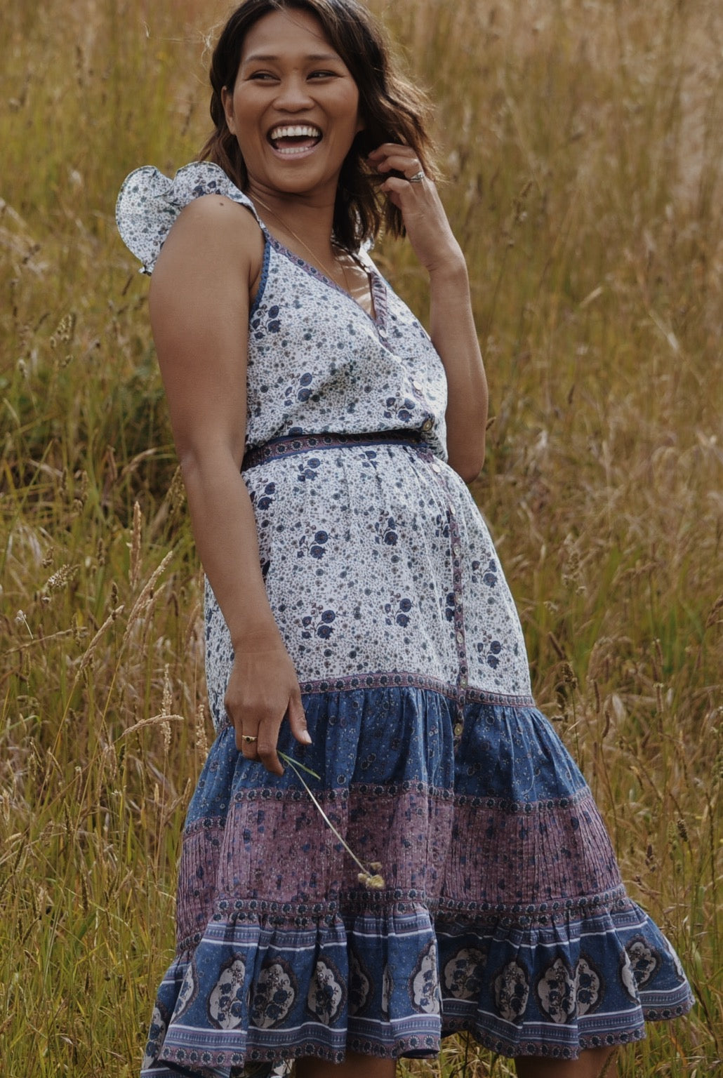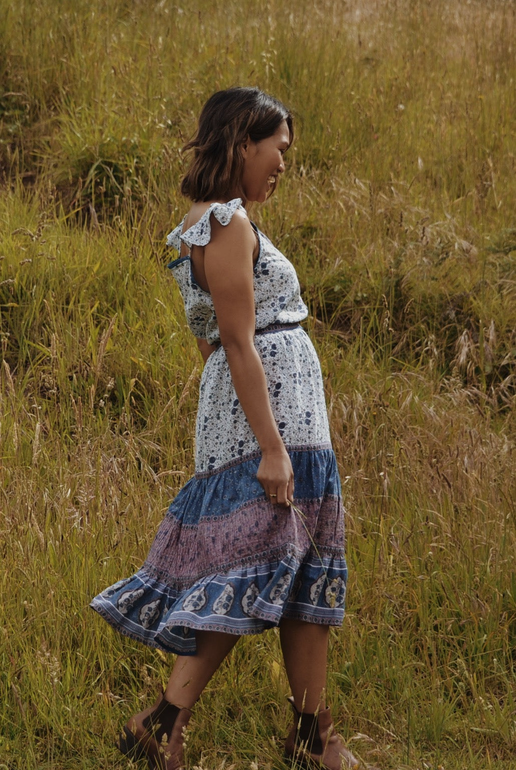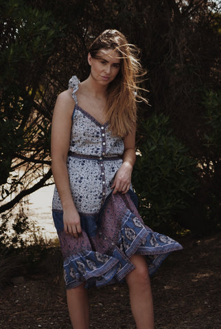 100% cotton. Made for slow breezy, balmy afternoons spent outside, sitting under the shade of big old trees, drinking home made iced tea to cool down. This style is wonderfully versatile and can be worn as a dress when paired with the Marais skirt or worn individually with another skirt or jeans. Made in a custom NEONAURAA print with a wonderfully bohemian feel. The button through front makes for easy breastfeeding. Beautifully feminine with gathering along shoestring straps.