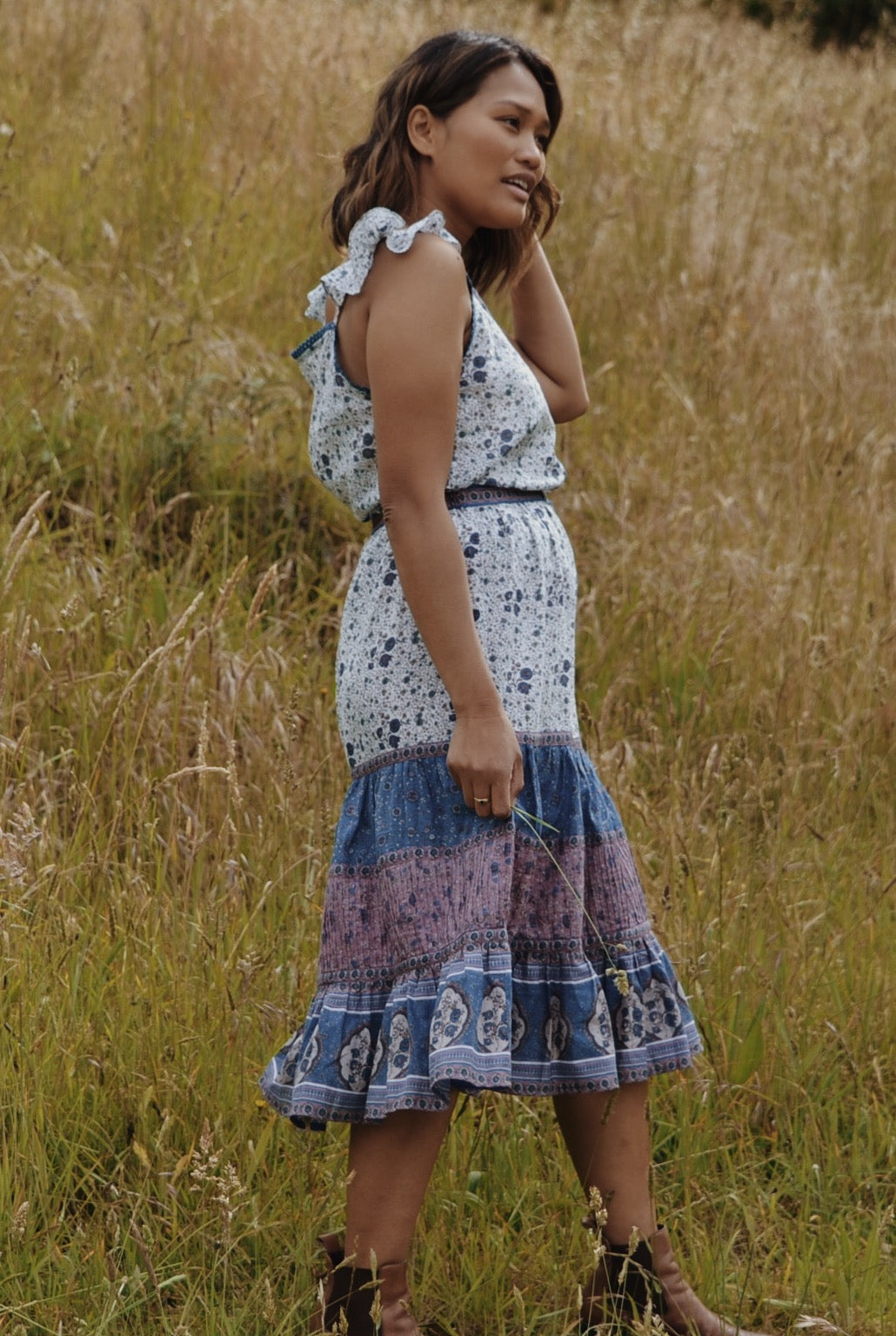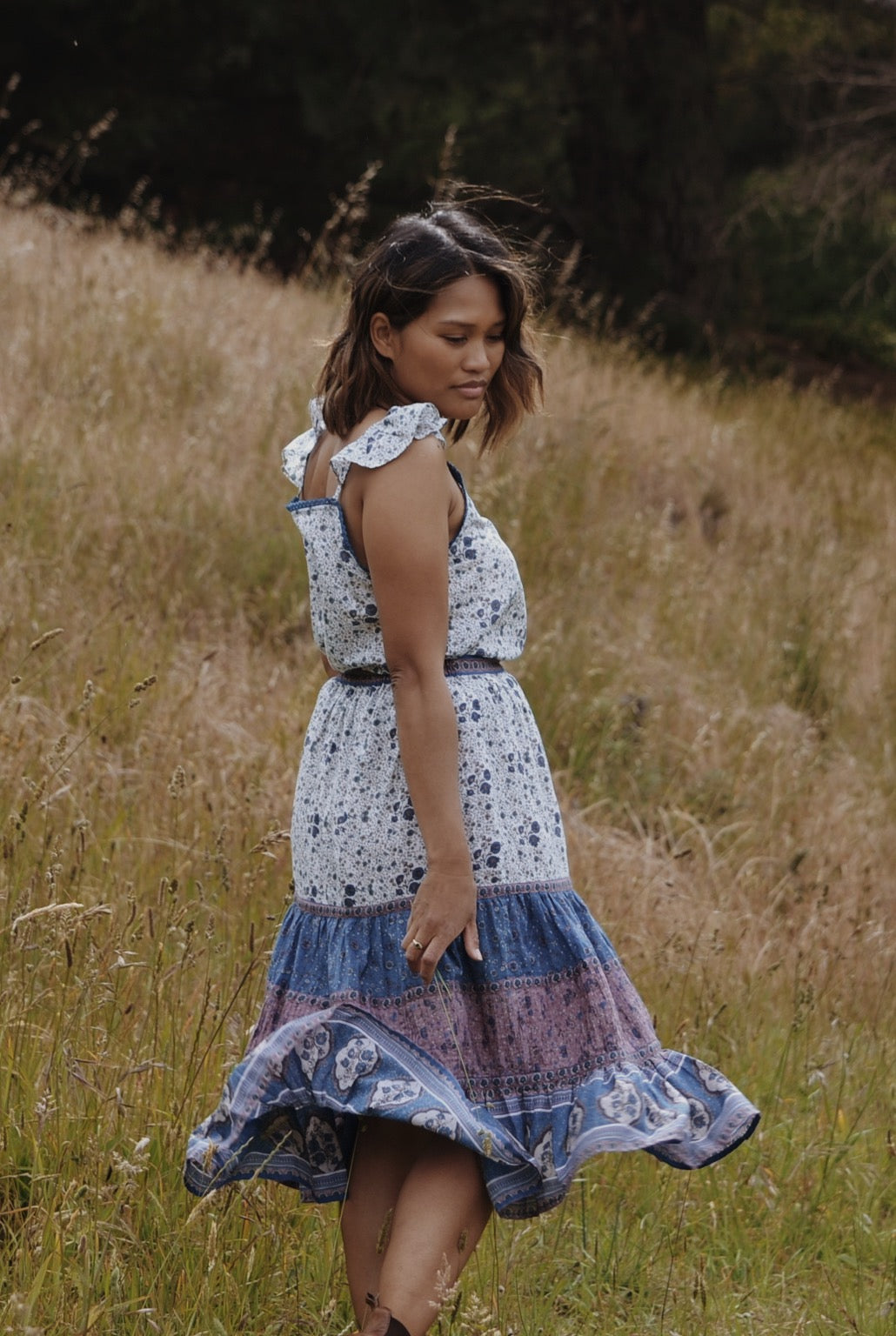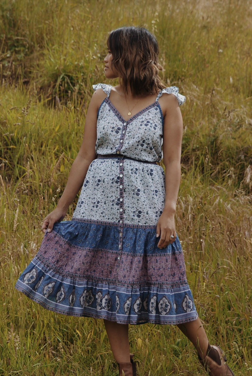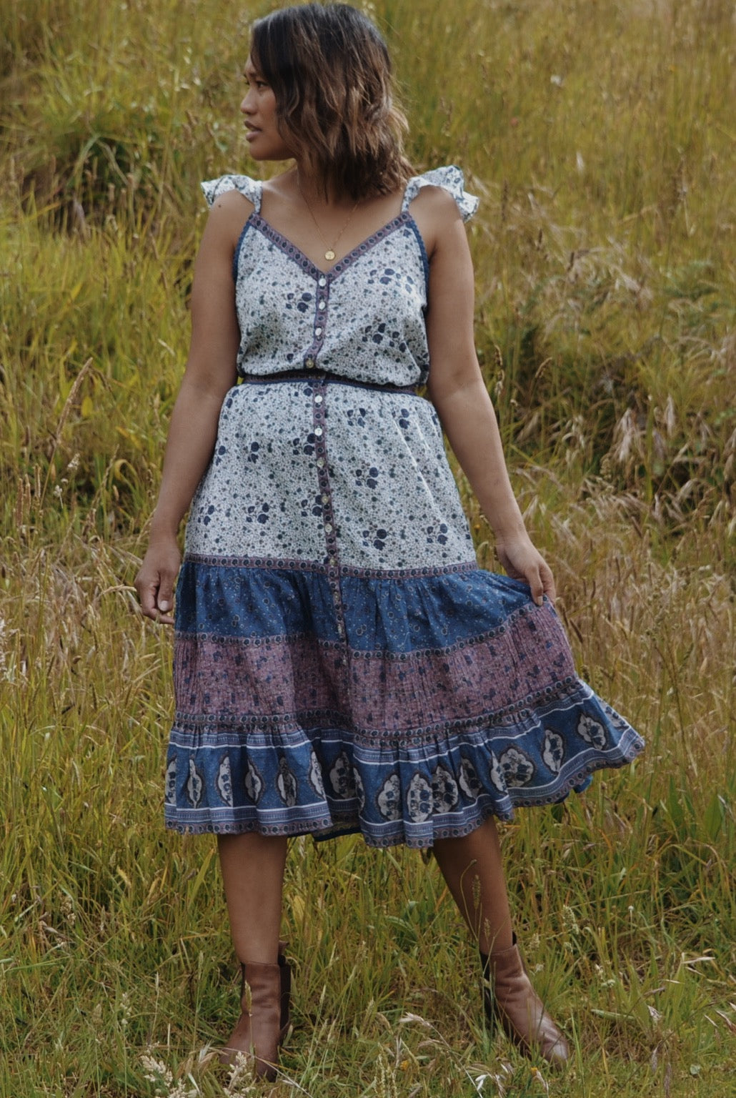 100% cotton. Made for slow breezy, balmy afternoons spent outside, sitting under the shade of big old trees, drinking home made iced tea to cool down. This style is wonderfully versatile and can be worn as a dress when paired with the Marais skirt or worn individually with another skirt or jeans. Made in a custom NEONAURAA print with a wonderfully bohemian feel. The button through front makes for easy breastfeeding. Beautifully feminine with gathering along shoestring straps.