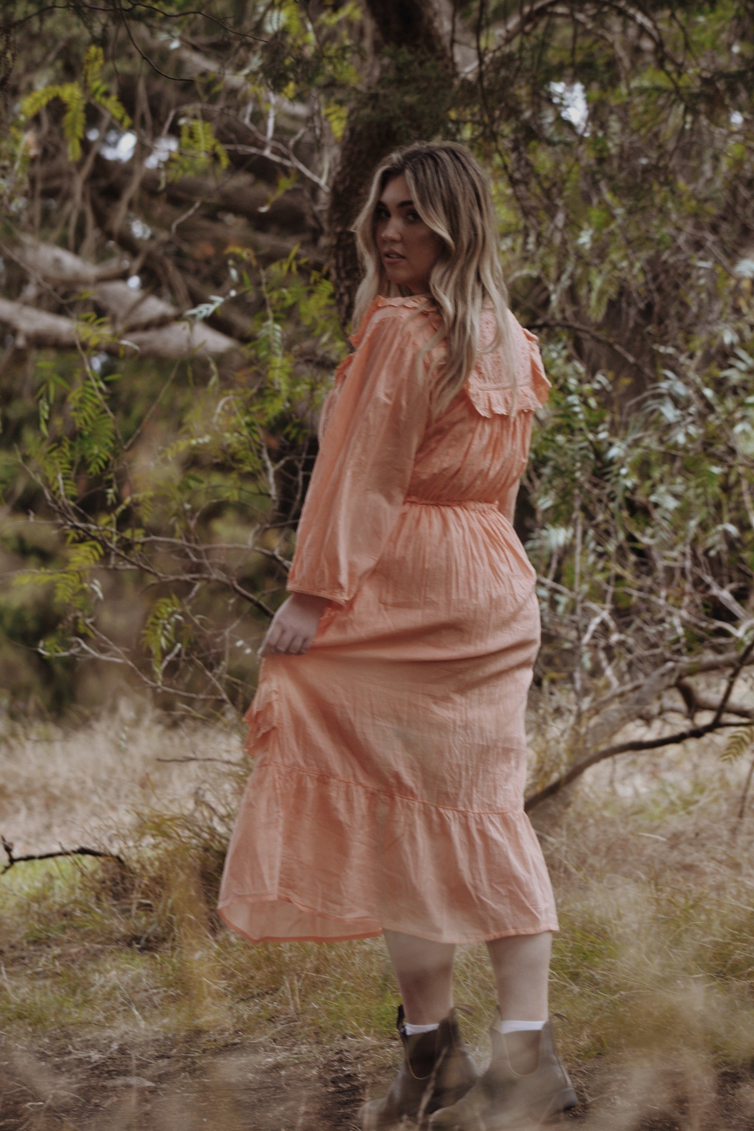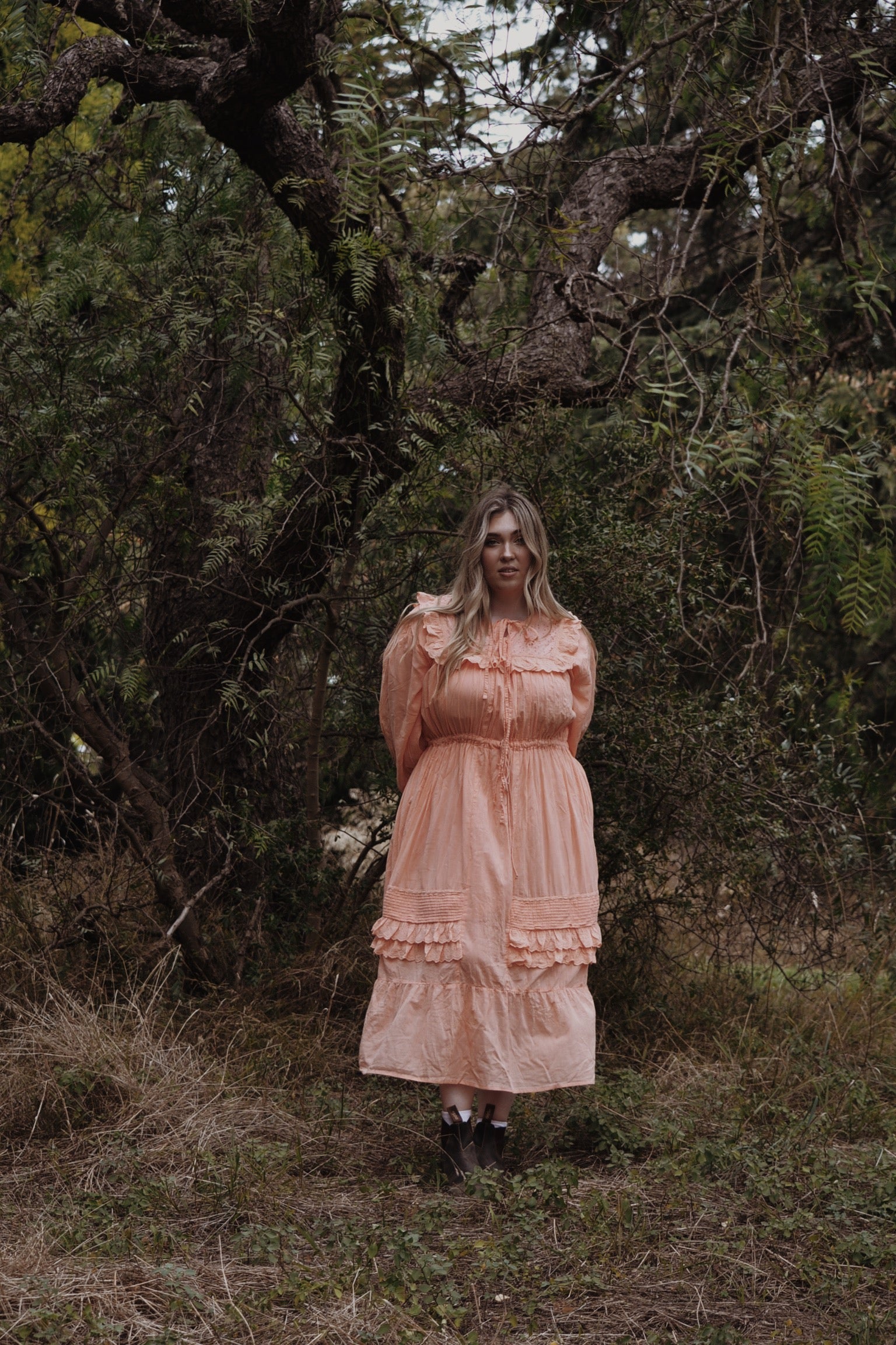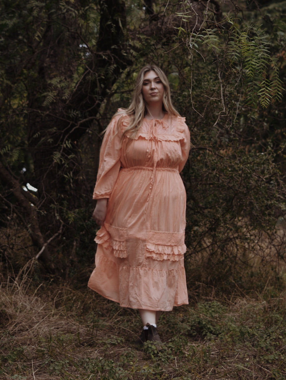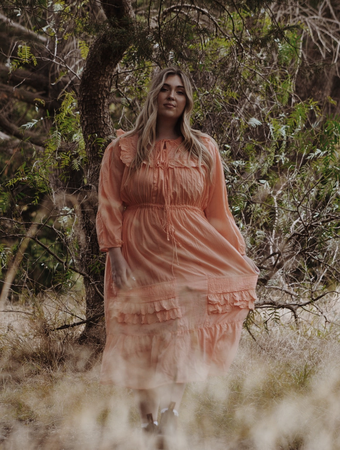 100% cotton. Bohemian luxury meets Little House on the Prairie, this beauty will have you dancing from slow days traipsing through the garden to dressier events such as an afternoon wedding on the grass. Gorgeously feminine with frill detailing and soft elasticised sleeves. A tie front opening makes breast feeding easy along with a drawstring waist that cinches to a figure flattering flowing skirt.