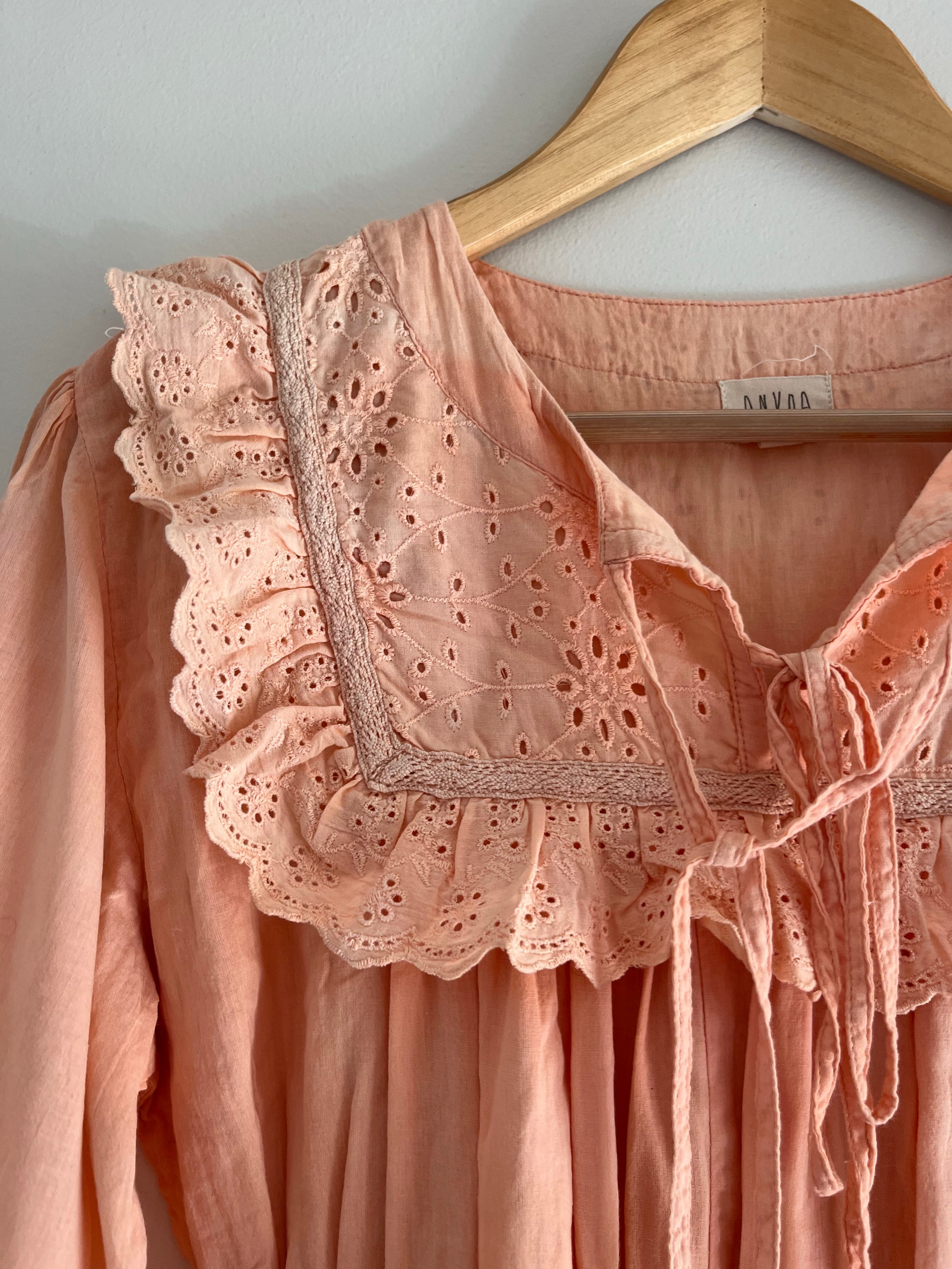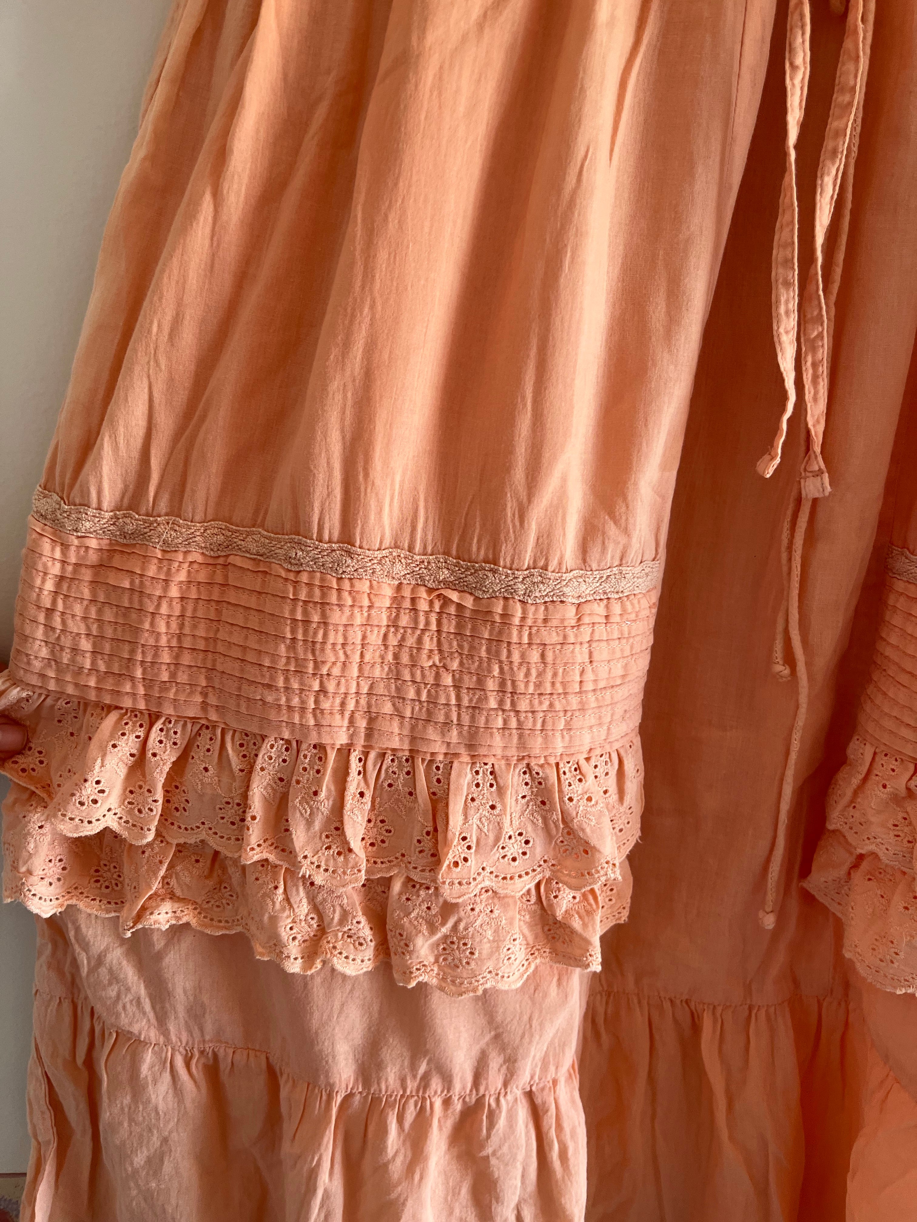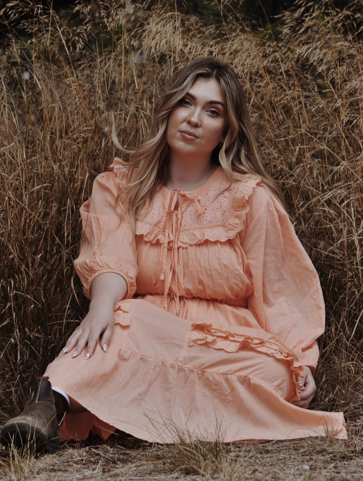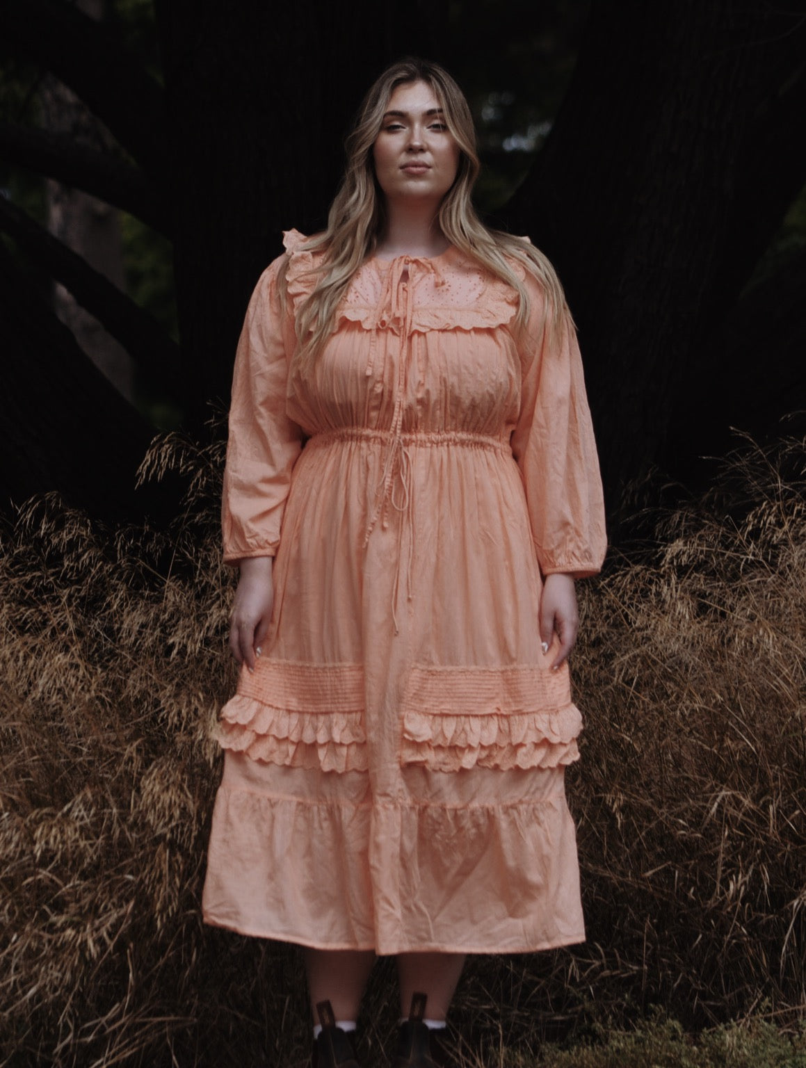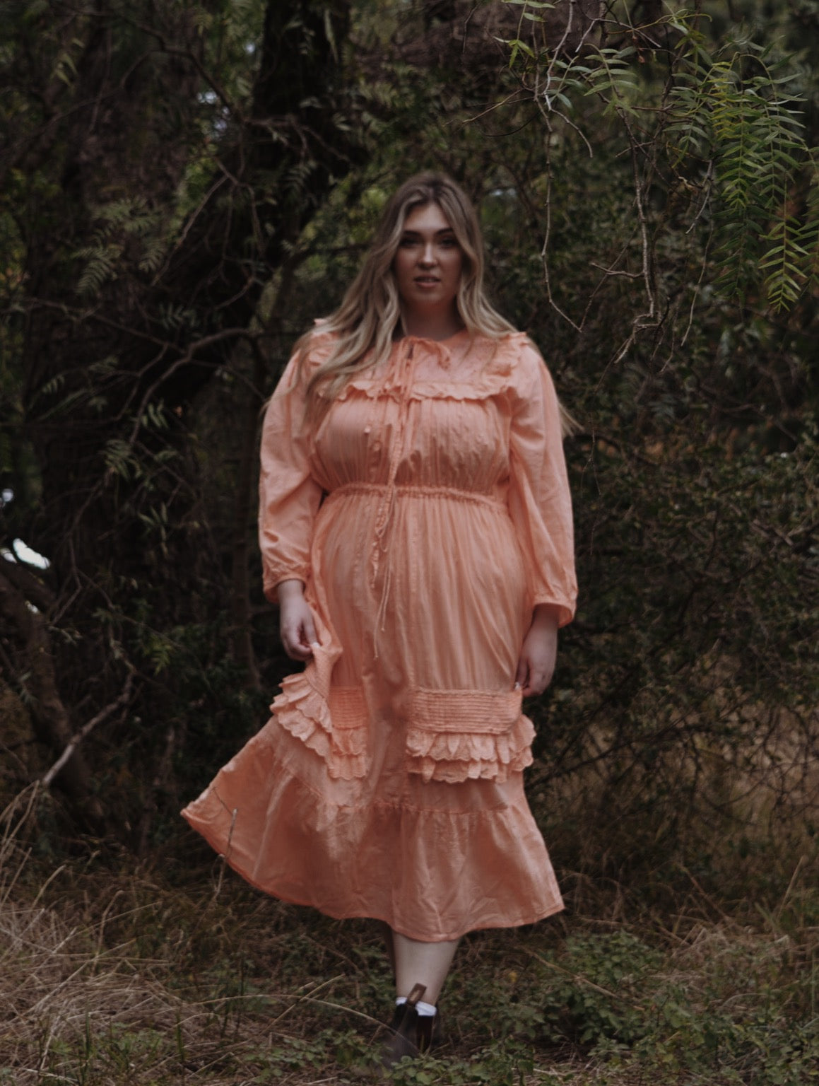 100% cotton. Bohemian luxury meets Little House on the Prairie, this beauty will have you dancing from slow days traipsing through the garden to dressier events such as an afternoon wedding on the grass. Gorgeously feminine with frill detailing and soft elasticised sleeves. A tie front opening makes breast feeding easy along with a drawstring waist that cinches to a figure flattering flowing skirt.