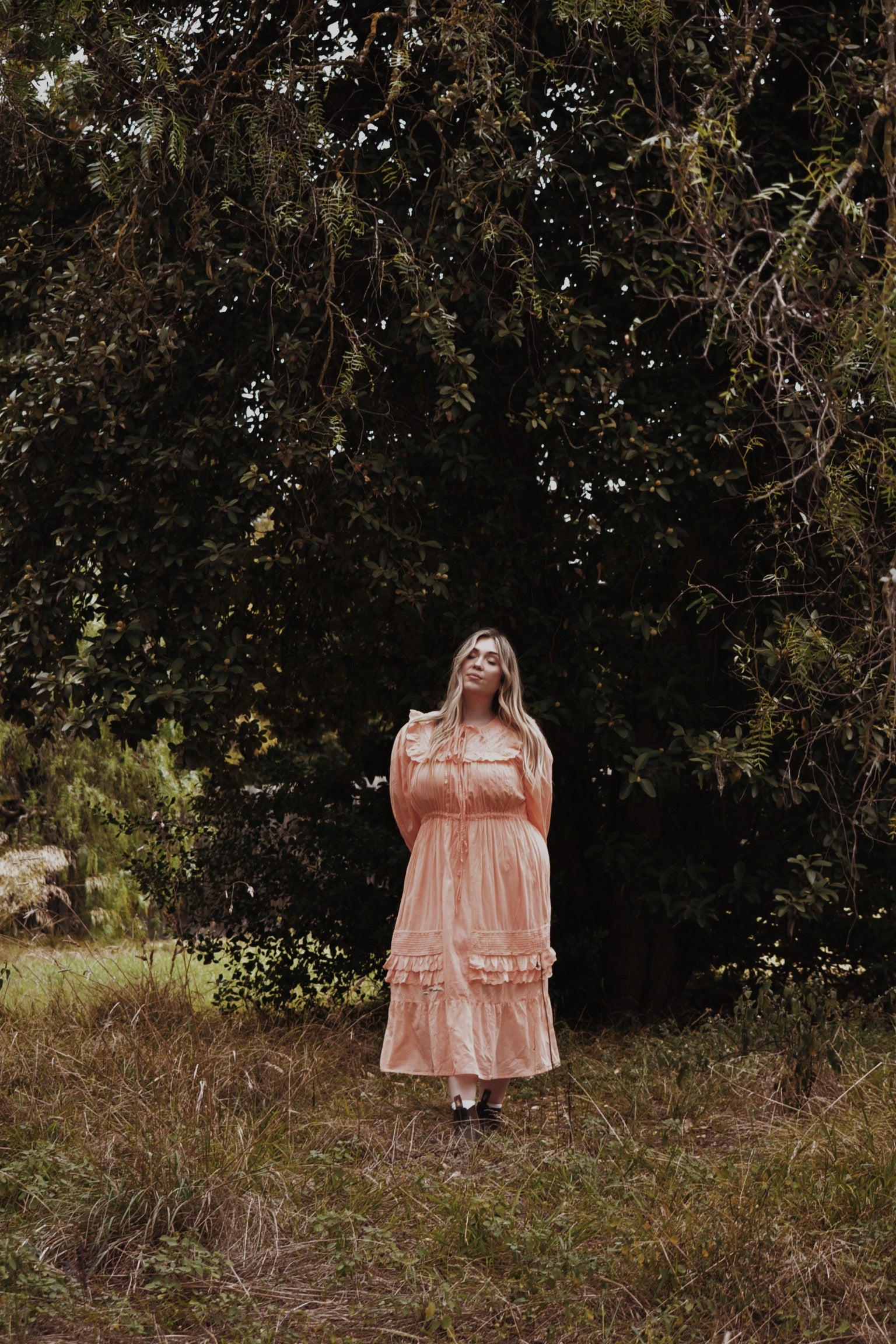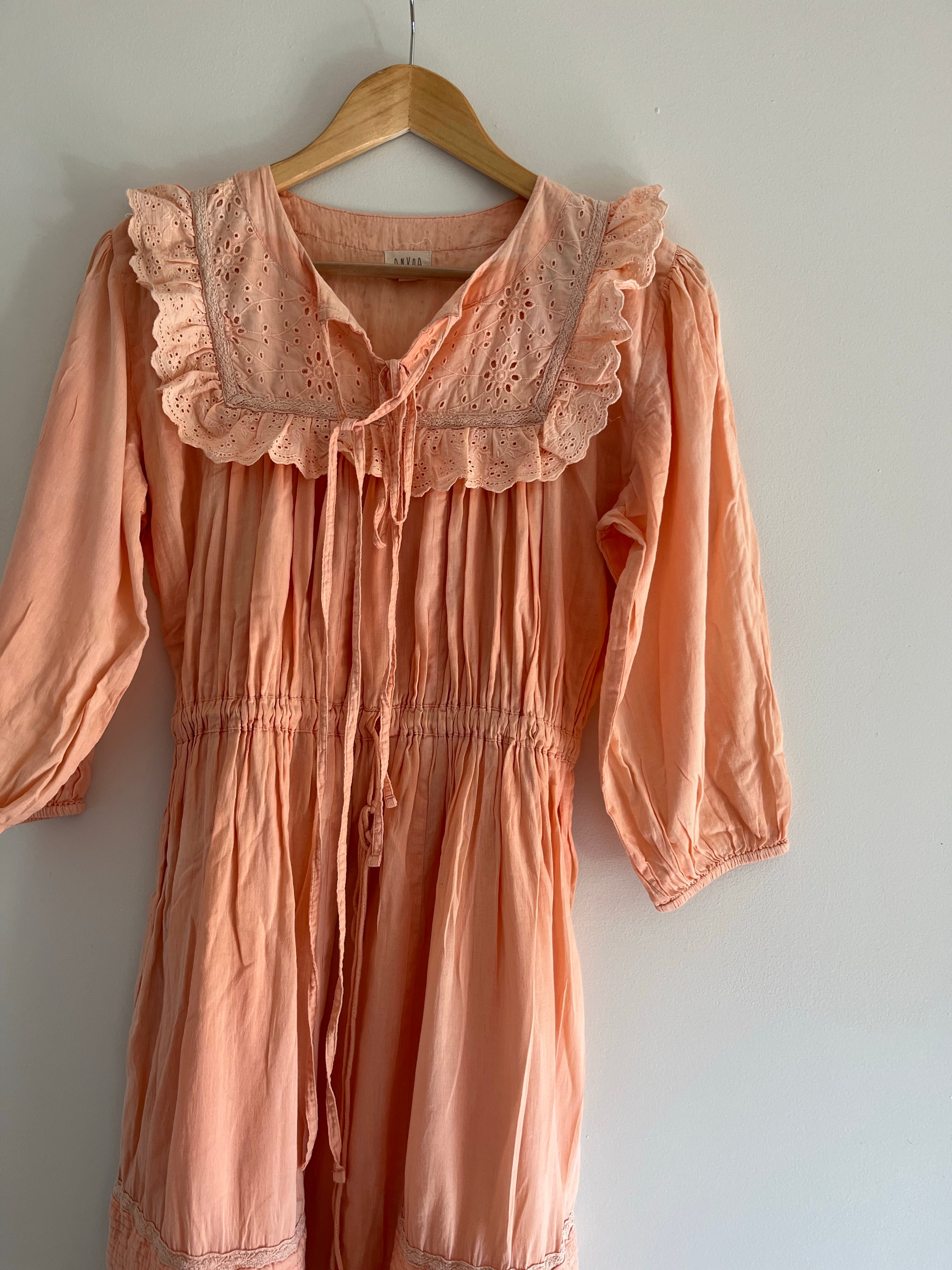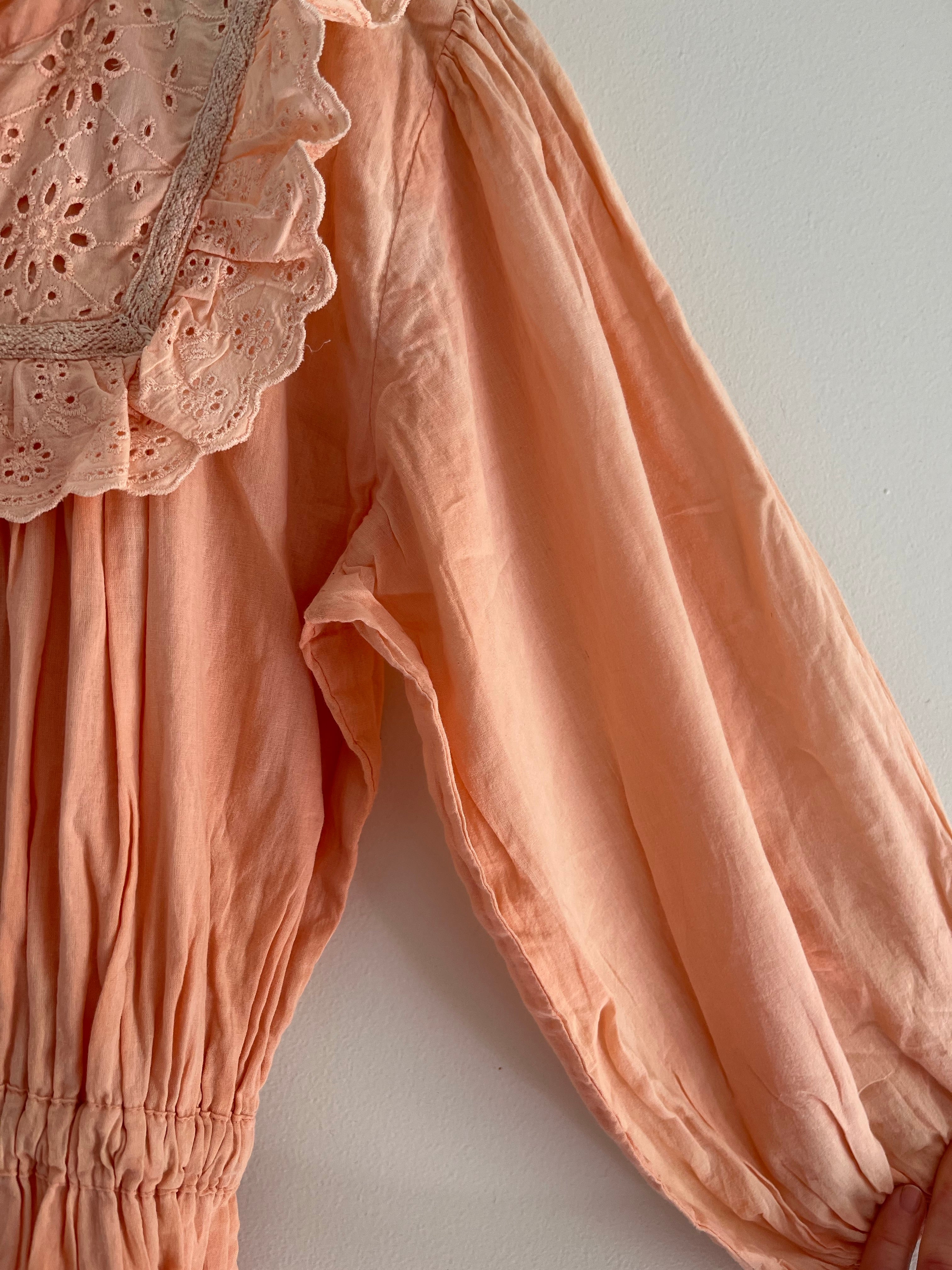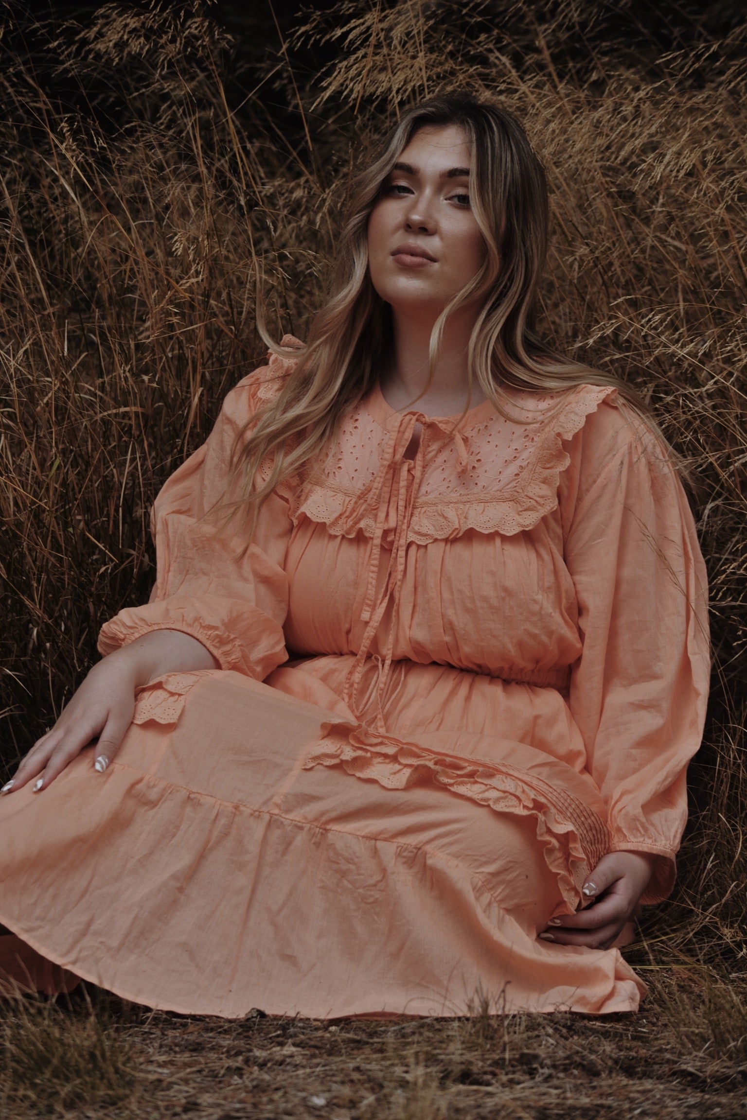 100% cotton. Bohemian luxury meets Little House on the Prairie, this beauty will have you dancing from slow days traipsing through the garden to dressier events such as an afternoon wedding on the grass. Gorgeously feminine with frill detailing and soft elasticised sleeves. A tie front opening makes breast feeding easy along with a drawstring waist that cinches to a figure flattering flowing skirt.