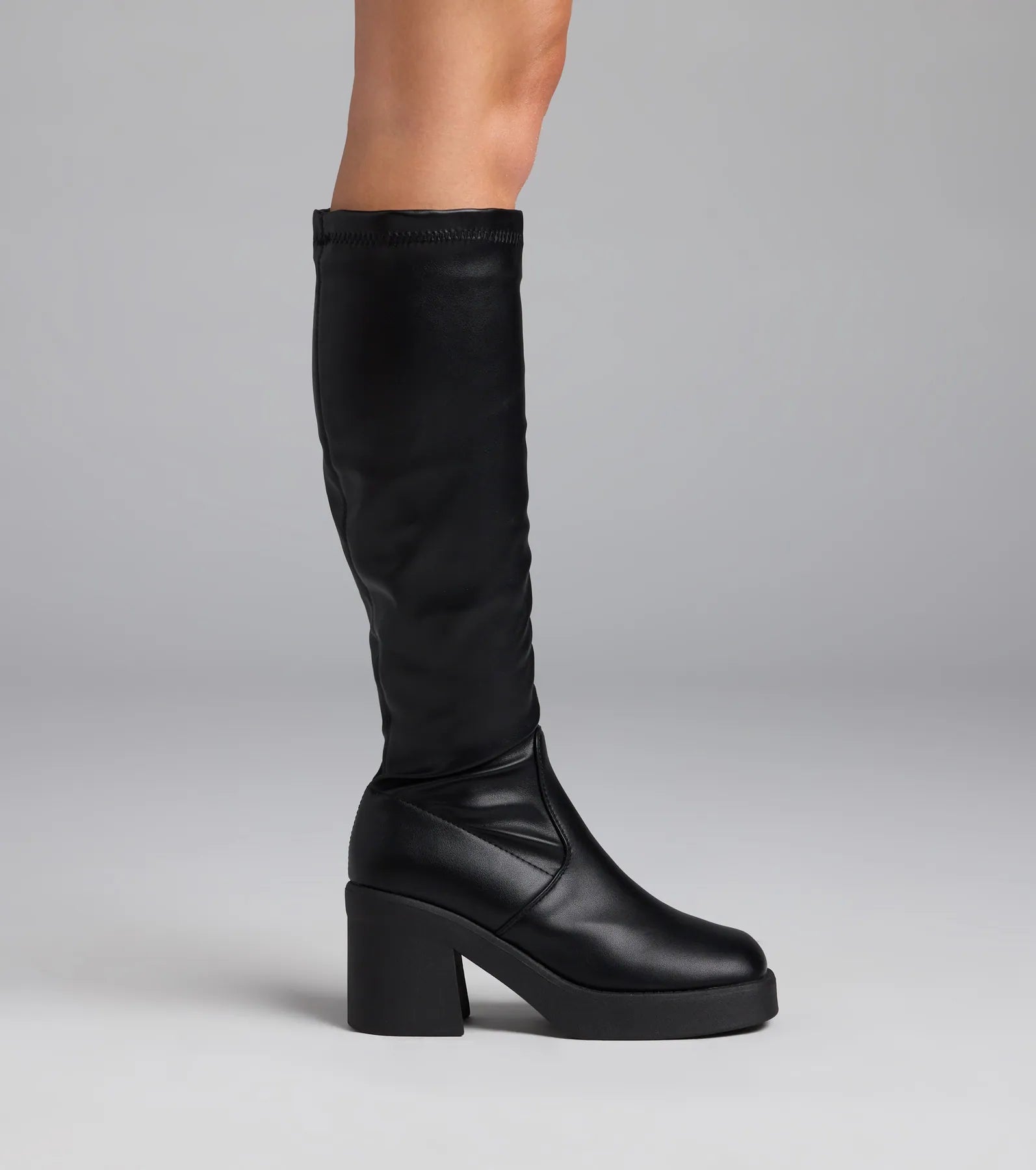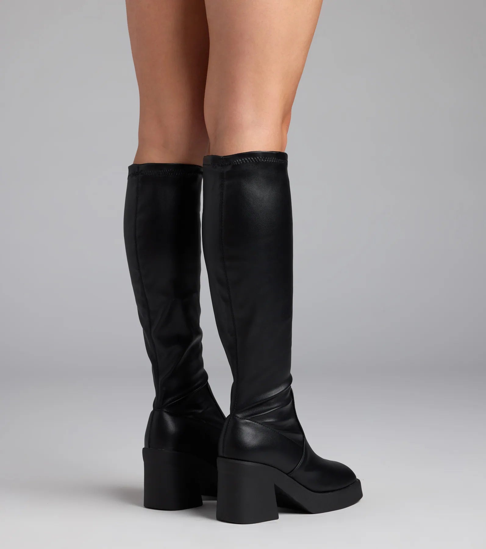 Step out in these edgy faux leather boots for day or night plans! These under-the-knee stunners are designed to be sleek and bold with a platform sole and block heel that adds trendy height to your look.