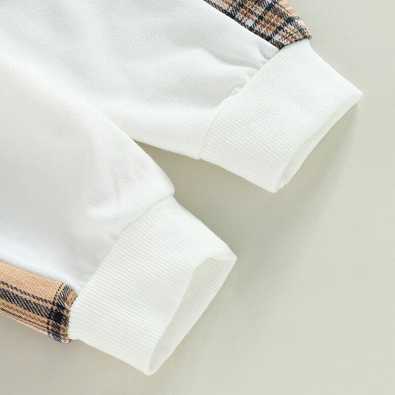 This unisex baby outfit is perfect for the little explorer who loves the great outdoors. The white sweatshirt features a plaid bear print, adding a playful and adventurous touch to the outfit. The matching pants are made of a durable and comfortable material, with an elastic waistband for a comfortable fit. Whether playing outside, visiting the park, or going on family adventures, this outfit will keep the baby comfortable and stylish.