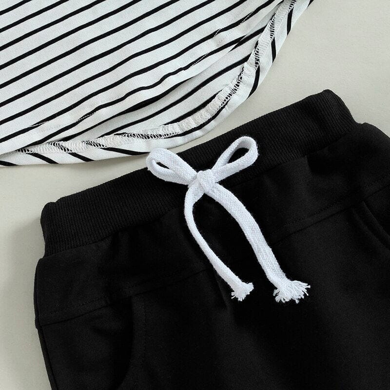 This little boy outfit is perfect for a day out with family or friends. The set includes a stylish striped tee in shades of black and white, with a unique brown front pocket that adds a pop of color and texture to the shirt. The solid black shorts are a versatile addition to the outfit, and can be paired with many different tops. This stylish and comfortable set is a great choice for any little boy who loves to play and have fun.